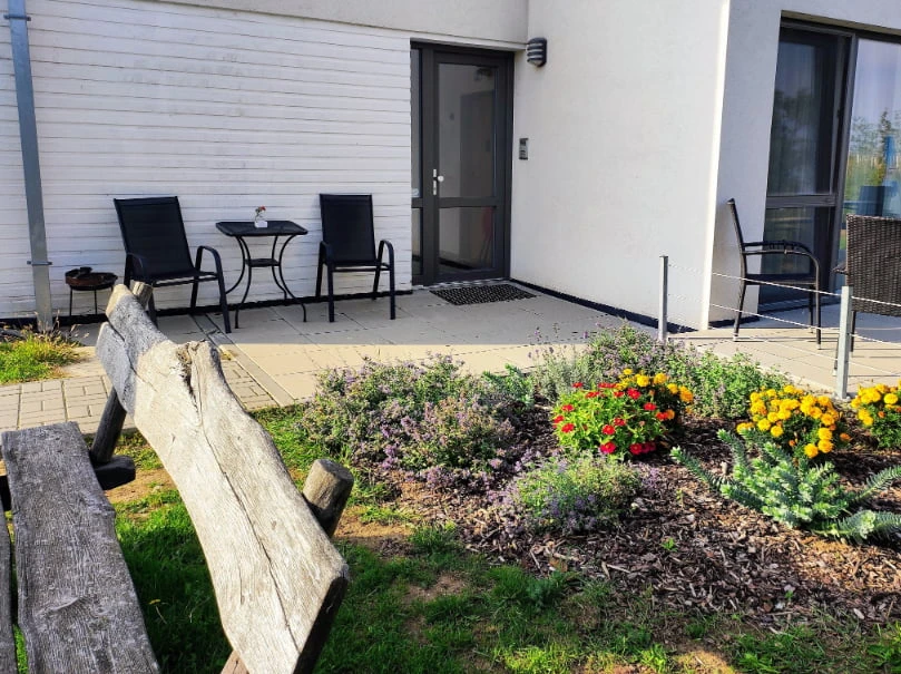 V přízemí je terasa. Hosté mohou také využít uzamykatelnou místnost pro uložení kočárků a jízdních kol.