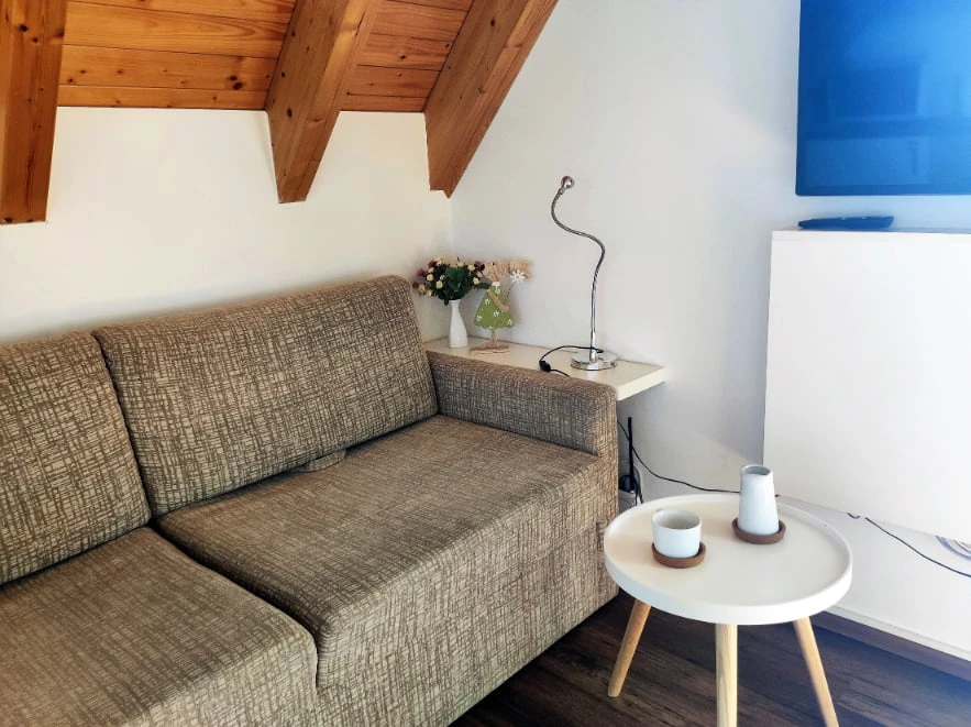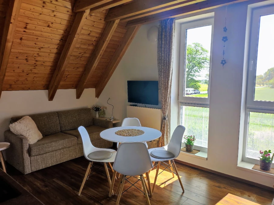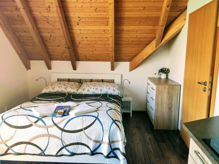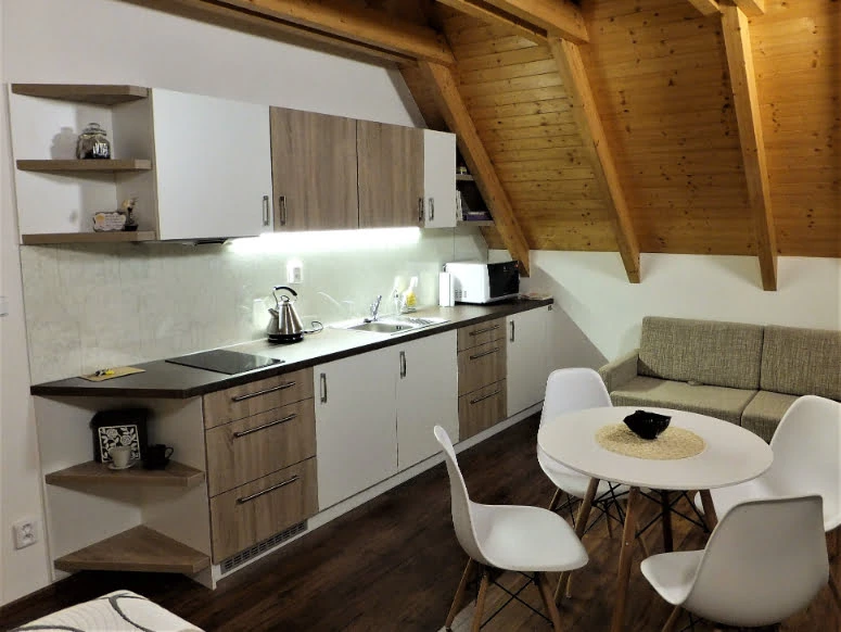 Jedná se o podkrovní apartmán s kuchyňským koutem vybaveným mikrovlnnou troubou a lednicí. Nechybí ani TV s plochou obrazovkou. Ve vlastní koupelně najdete sprchu.