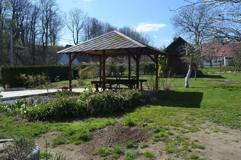 - Zahrada nabízí houpačky, skluzavku a trampolínu.