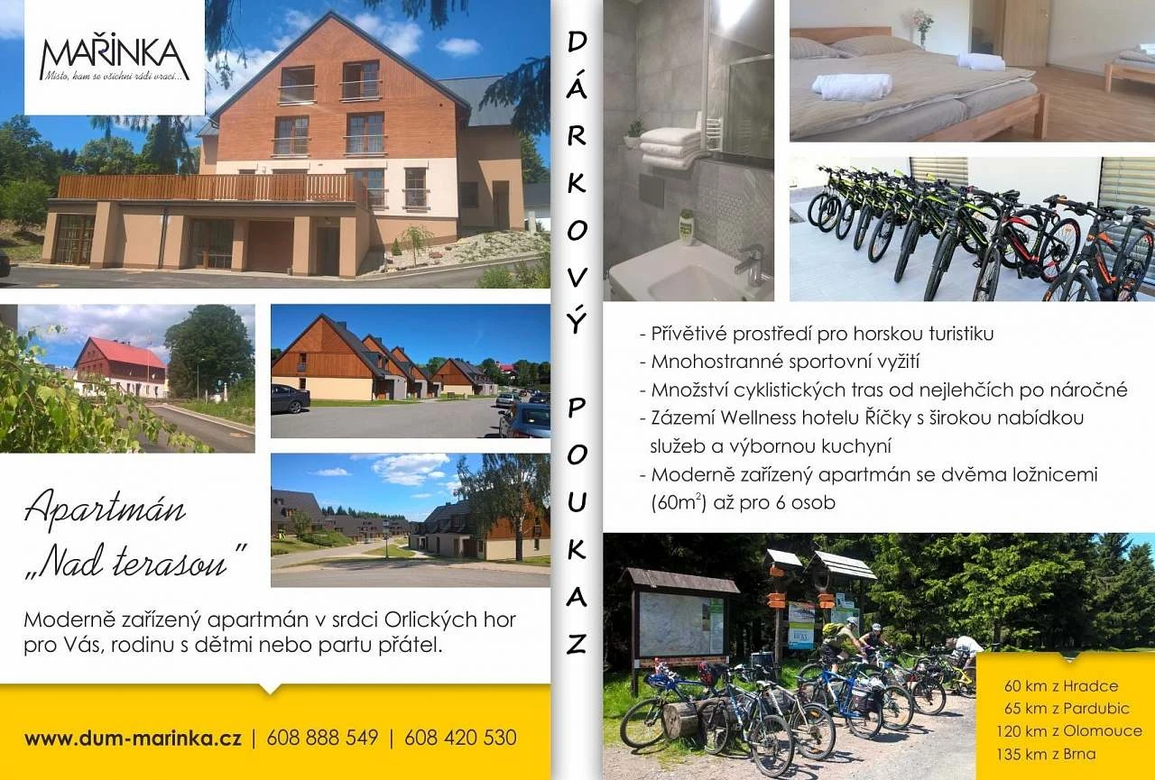 Apartmán Nad terasou se nachází v klidném prostředí Orlických hor a je ideální pro ty, kteří preferují poklidnou turistiku před přeplněnými horskými středisky. Oblast vyniká lesy bez kůrovce a mírně zvlněným terénem.