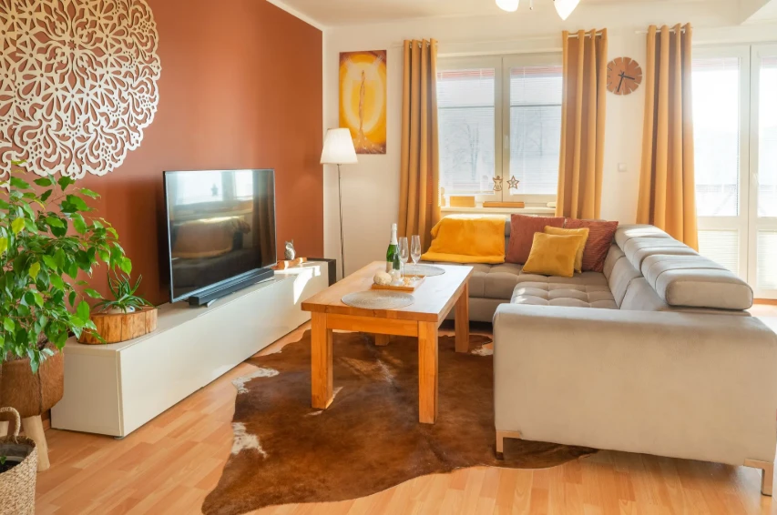 - Obývací pokoj s velkým rozkládacím gaučem a televizí