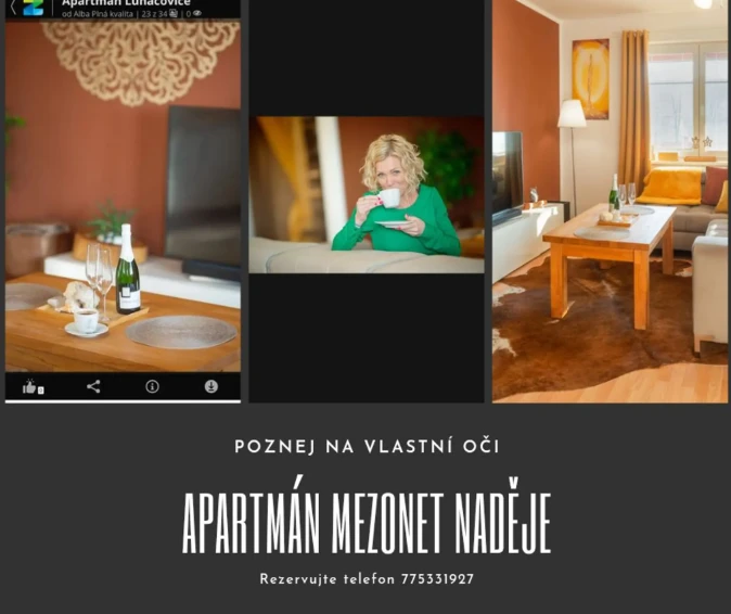 Apartmán Naděje nabízí ubytování v prostorném mezonetovém apartmánu o velikosti 100 m², který se nachází ve druhém nadzemním podlaží bytového domu. Součástí apartmánu je podkroví, kde jsou umístěny dvě ložnice.