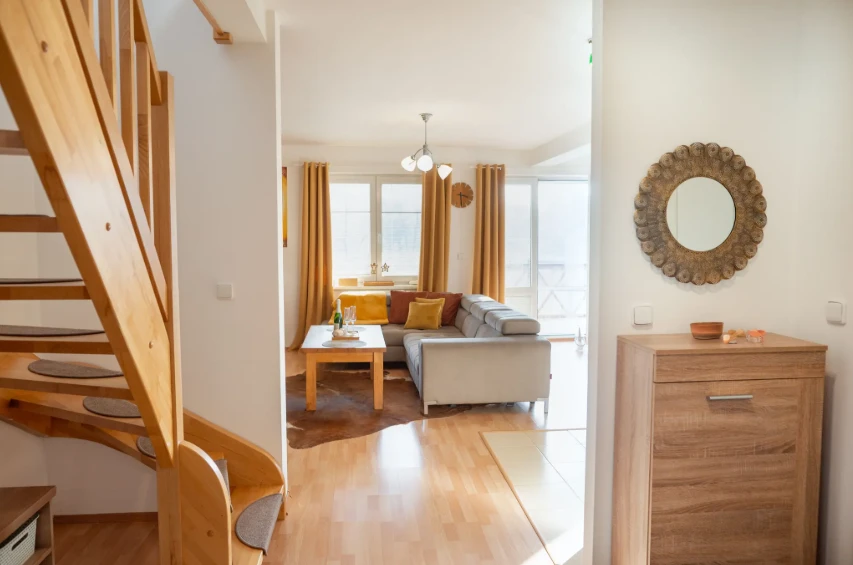 V prvním podlaží apartmánu se nachází obývací část s pohodlným gaučem, televizí a jídelním koutem.