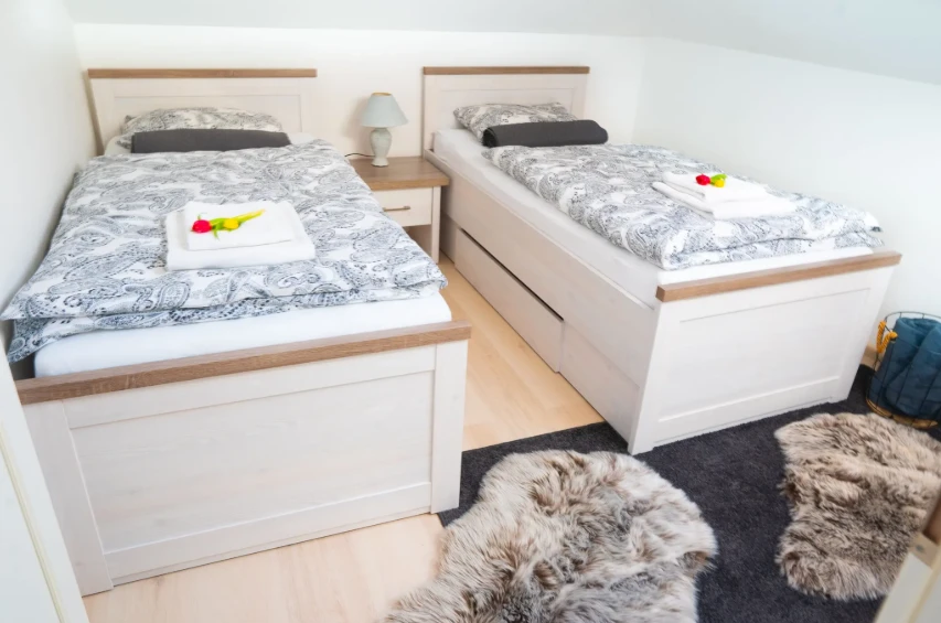 - Dvě ložnice (manželská postel + lůžko pro dítě do 9 let, dvě samostatné postele)
