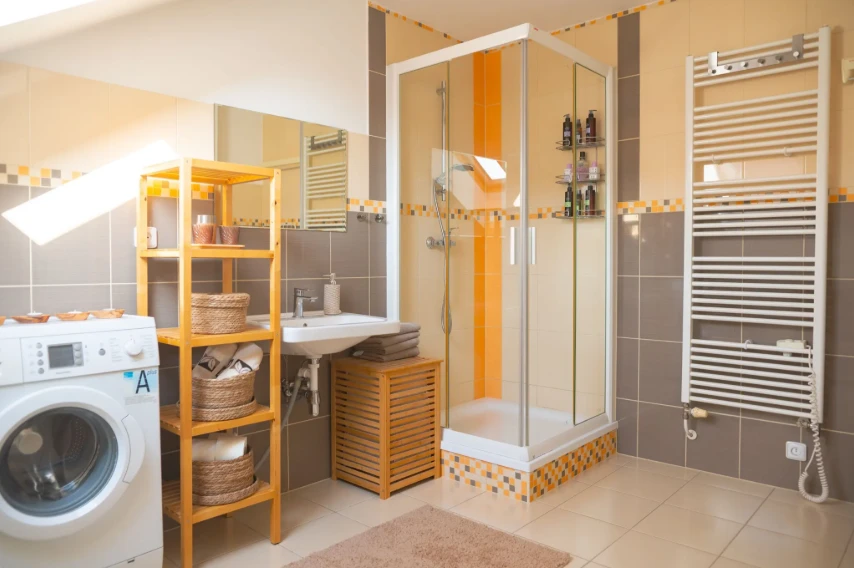 Apartmán má dvě koupelny – jedna je vybavena vanou, druhá sprchovým koutem. K dispozici je také pračka a sušička, což ocení zejména hosté při delších pobytech.