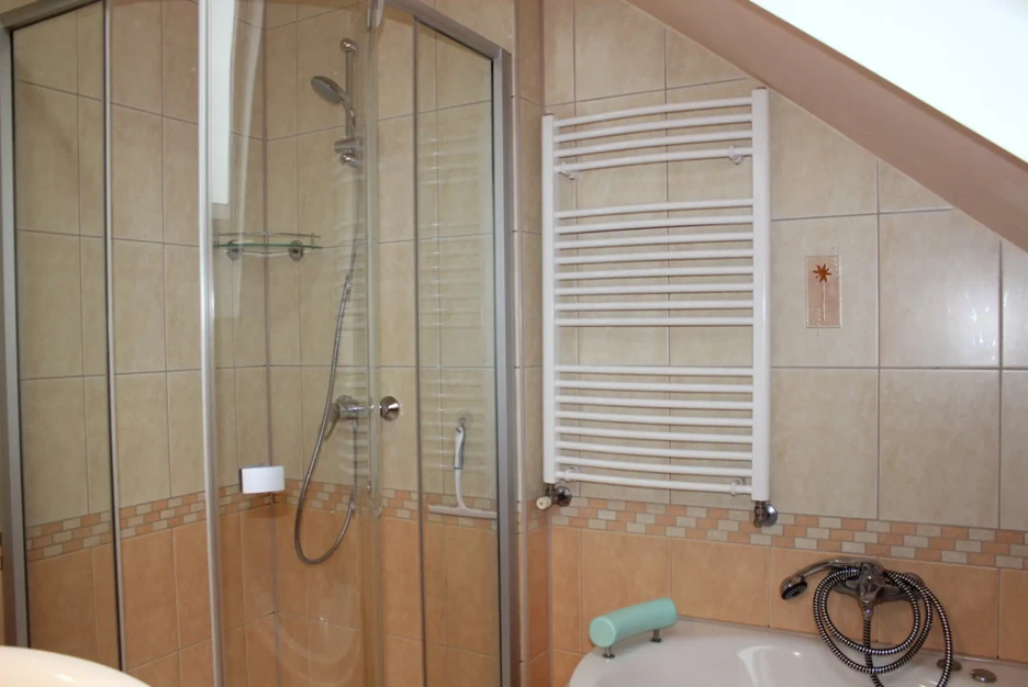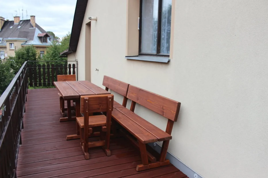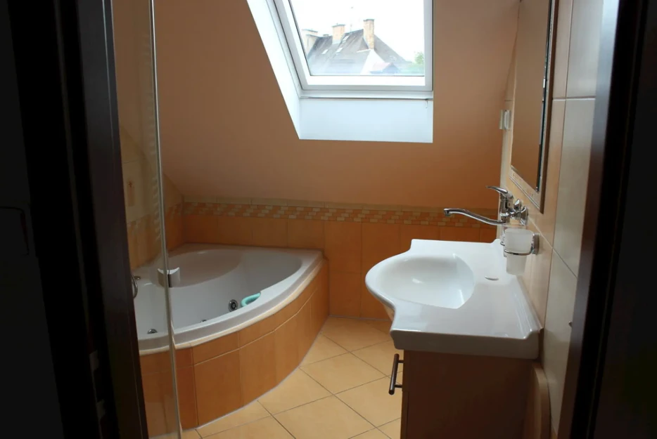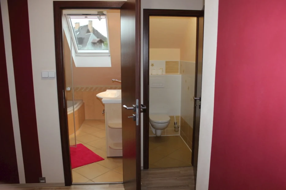 Koupelna je vybavena sprchovým koutem i rohovou vanou, toaleta je oddělená. Z apartmánu je přístup na balkon s venkovním posezením.