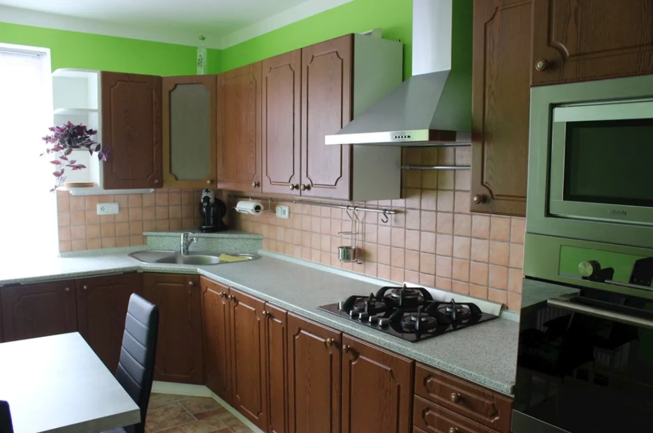 Kuchyně je plně zařízená a zahrnuje plynový sporák, elektrickou troubu, mikrovlnnou troubu, rychlovarnou konvici, lednici, mrazák, kávovar, myčku nádobí a jídelní stůl.