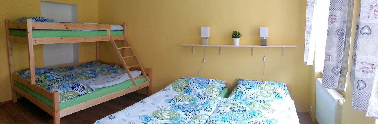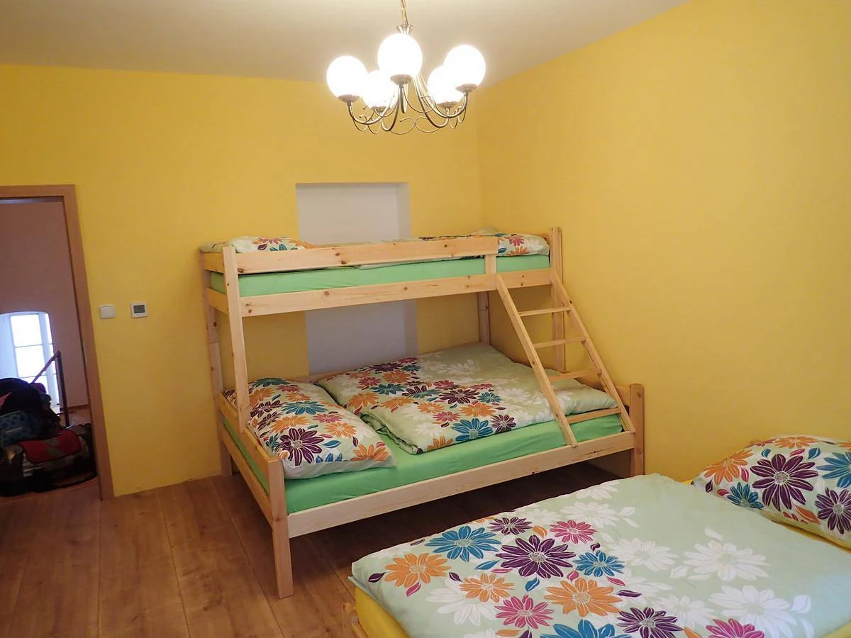 - Větší pokoj: Obsahuje 5 lůžek včetně jedné patrové postele.
