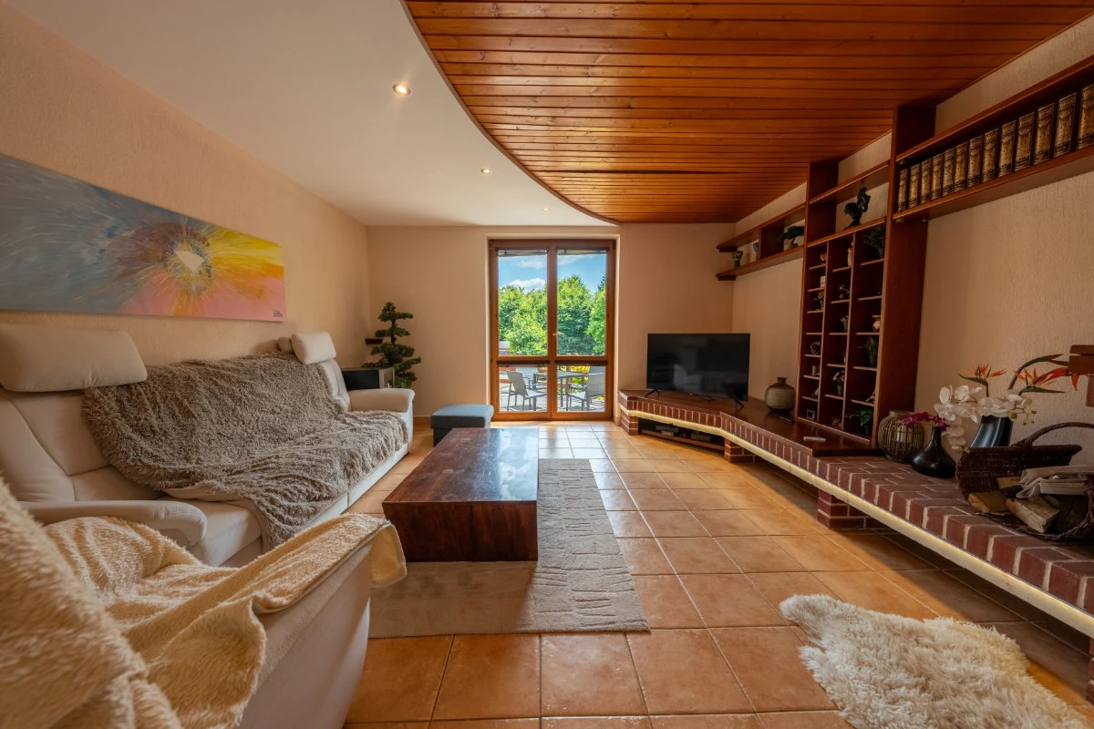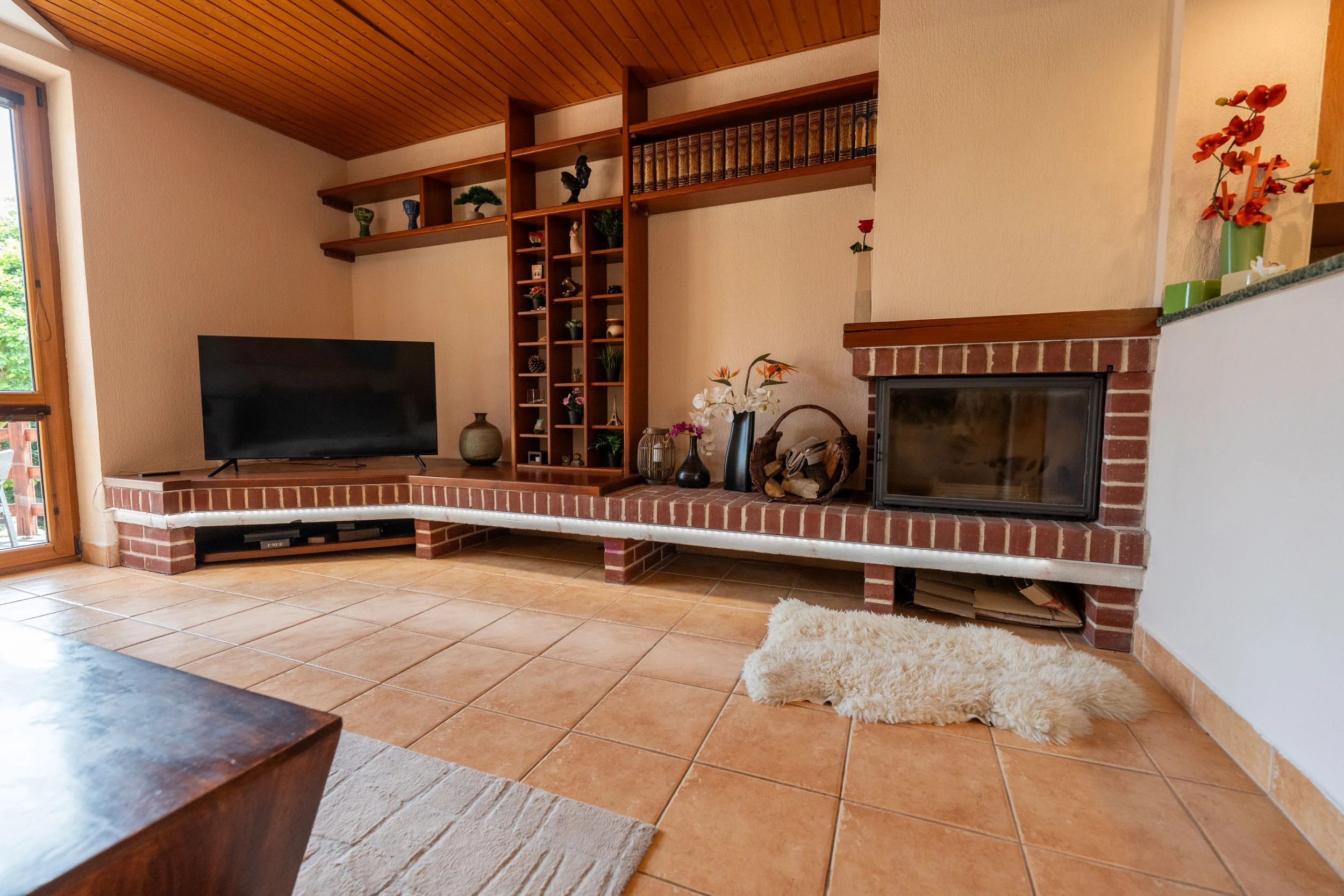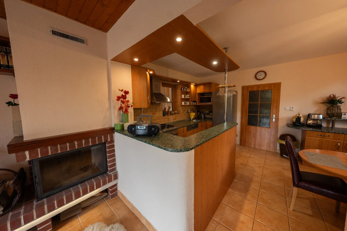 - Obývací pokoj: sedačka, konferenční stolek, krb, vinotéka, TV