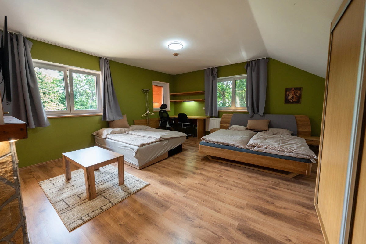 - Ložnice 1: manželská postel, rozkládací pohovka, psací stůl, velká skříň (pro 4 osoby)