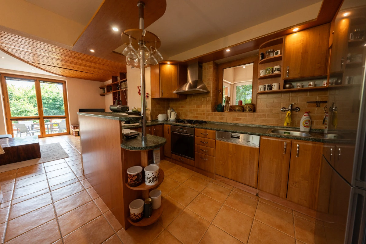 - Kuchyň: kávovar, sklenice na víno a pivo, sada talířů pro 12 osob, lednice, mraznička, příbory, mikrovlnná trouba, plynový sporák, toastovač, indukční varná deska, přenosný chladič piva