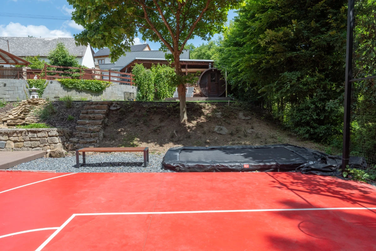 Apartmán Pod Buchlovem je vybaven venkovní saunou na dřevo, která je doplněna terasou a ochlazovací kádí. Pro venkovní posezení je k dispozici prostor pro až 12 osob, včetně možnosti využití vodní dýmky. Posilovna nabízí základní vybavení pro udržení kondice během pobytu. Sportovní hřiště s nočním osvětlením je vhodné pro basketbal a na zahradě se nachází zapuštěná trampolína. Herna zahrnuje kulečník, šipky, stolní fotbálek a stolní tenis, což poskytuje zábavu pro skupiny i jednotlivce.
