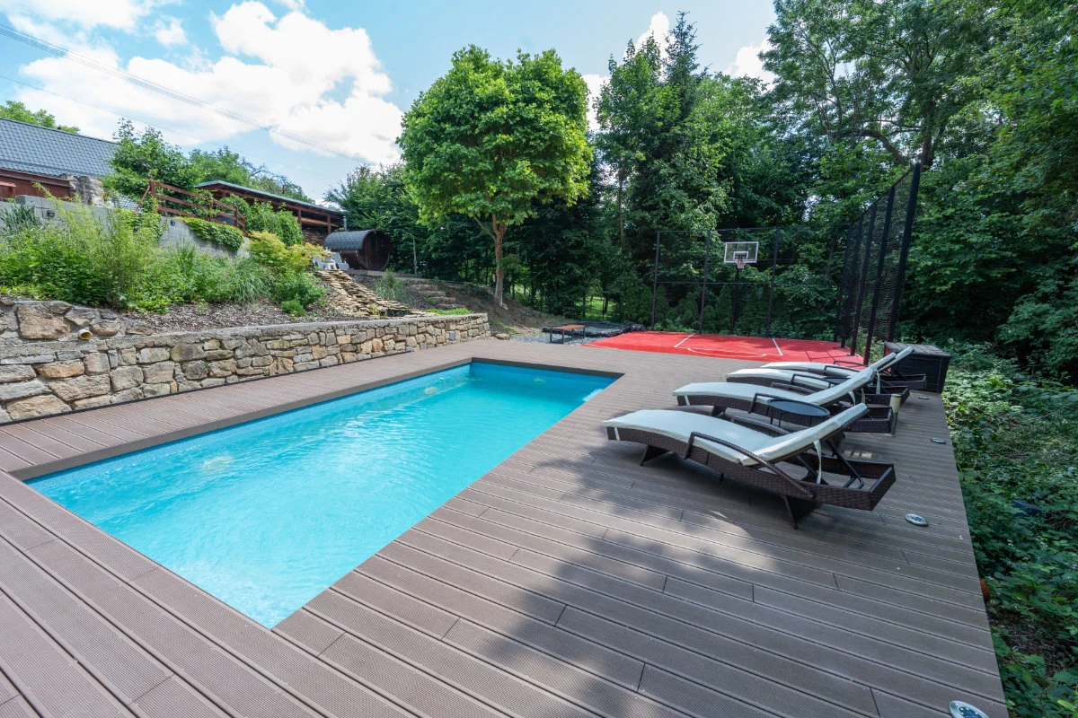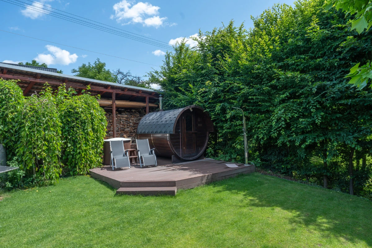 - Venkovní sauna na dřevo s terasou a ochlazovací kádí