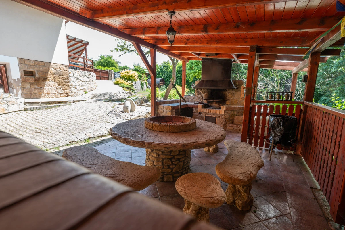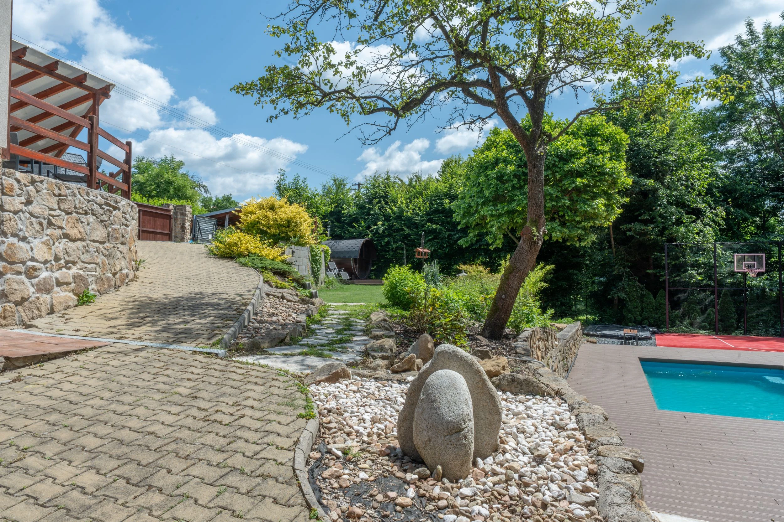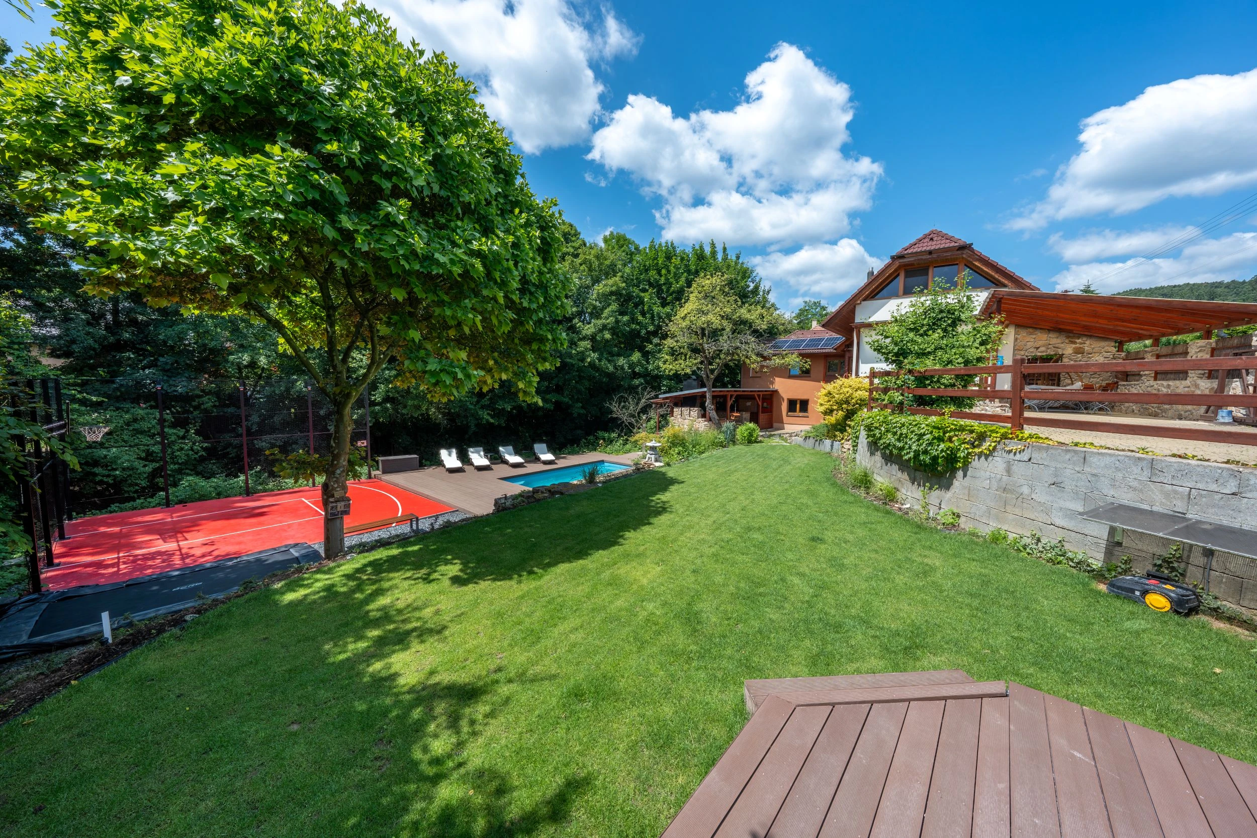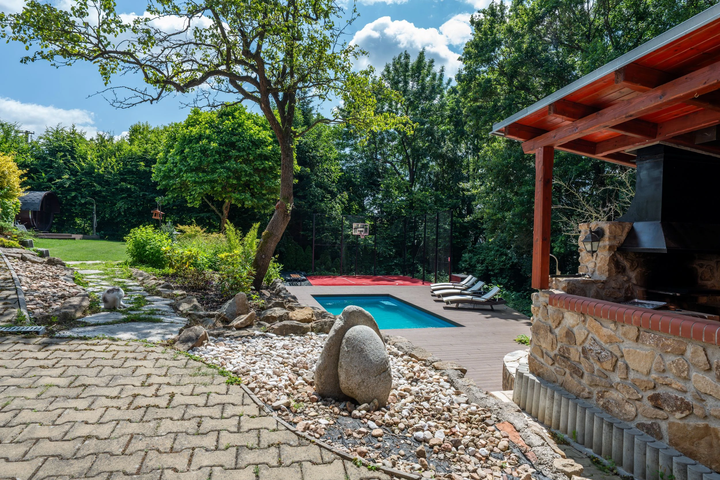 - Zahrada: venkovní posezení s krbem na grilování a barem, terasa s balkonem, jezírko s tekoucí vodou