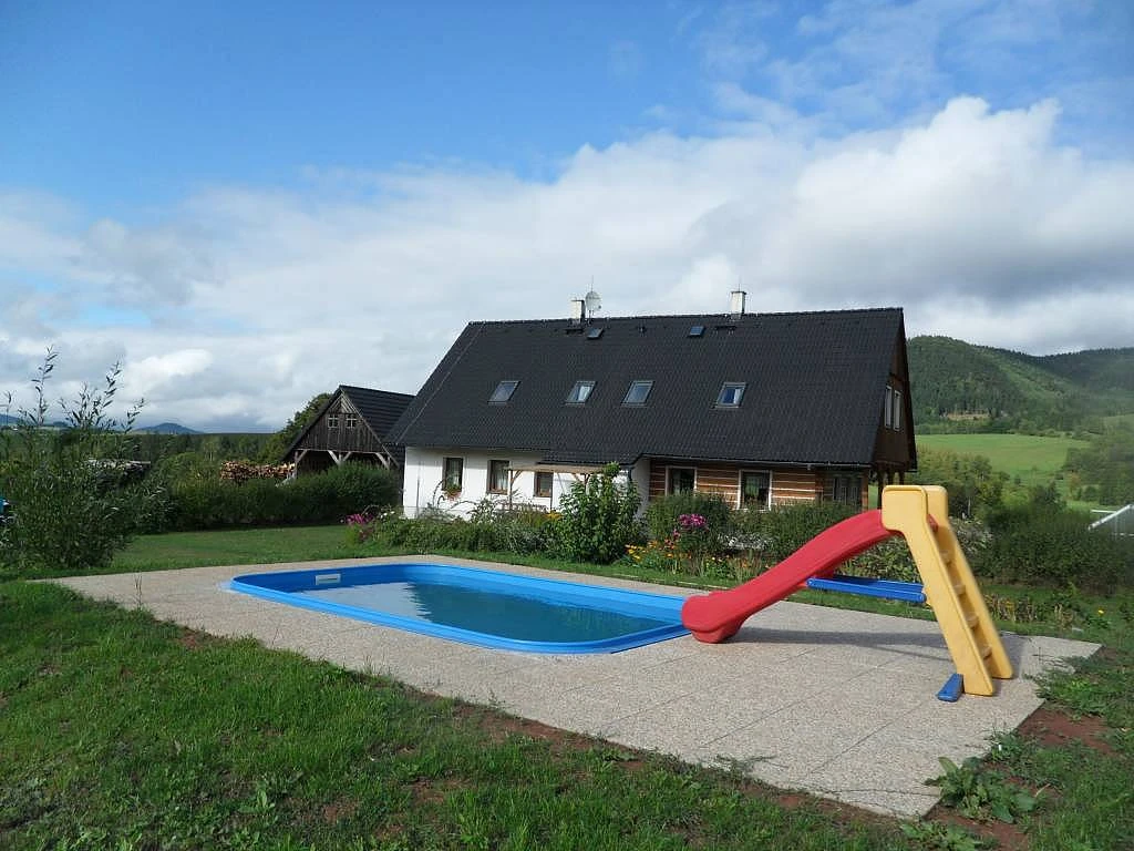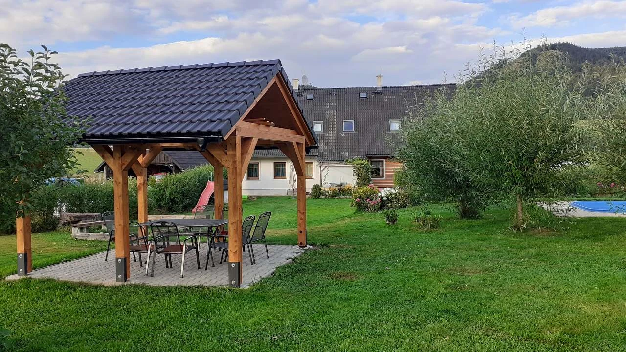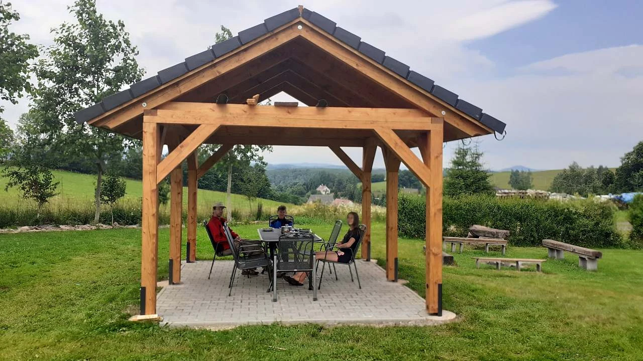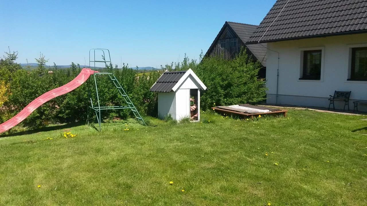 Venkovní posezení pod pergolou. Venkovní ohniště. Dětské hřiště s pískovištěm, klouzačkou houpačkou a tabulí. Venkovní zahrada.
