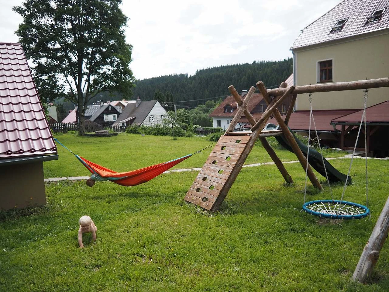 Dětské hřiště - houpačka, klouzačka, pískoviště.