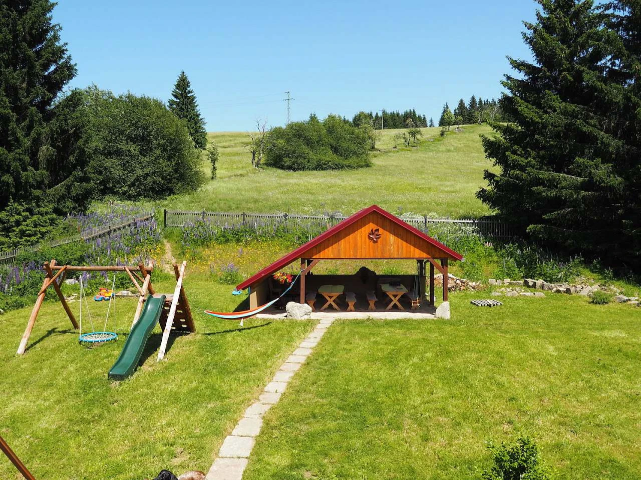 K dispozici je také společenská místnost s velkou kuchyňskou linkou pro společné vaření, krbovými kamny, posezením pro 24 osob, dětským koutkem a WC.