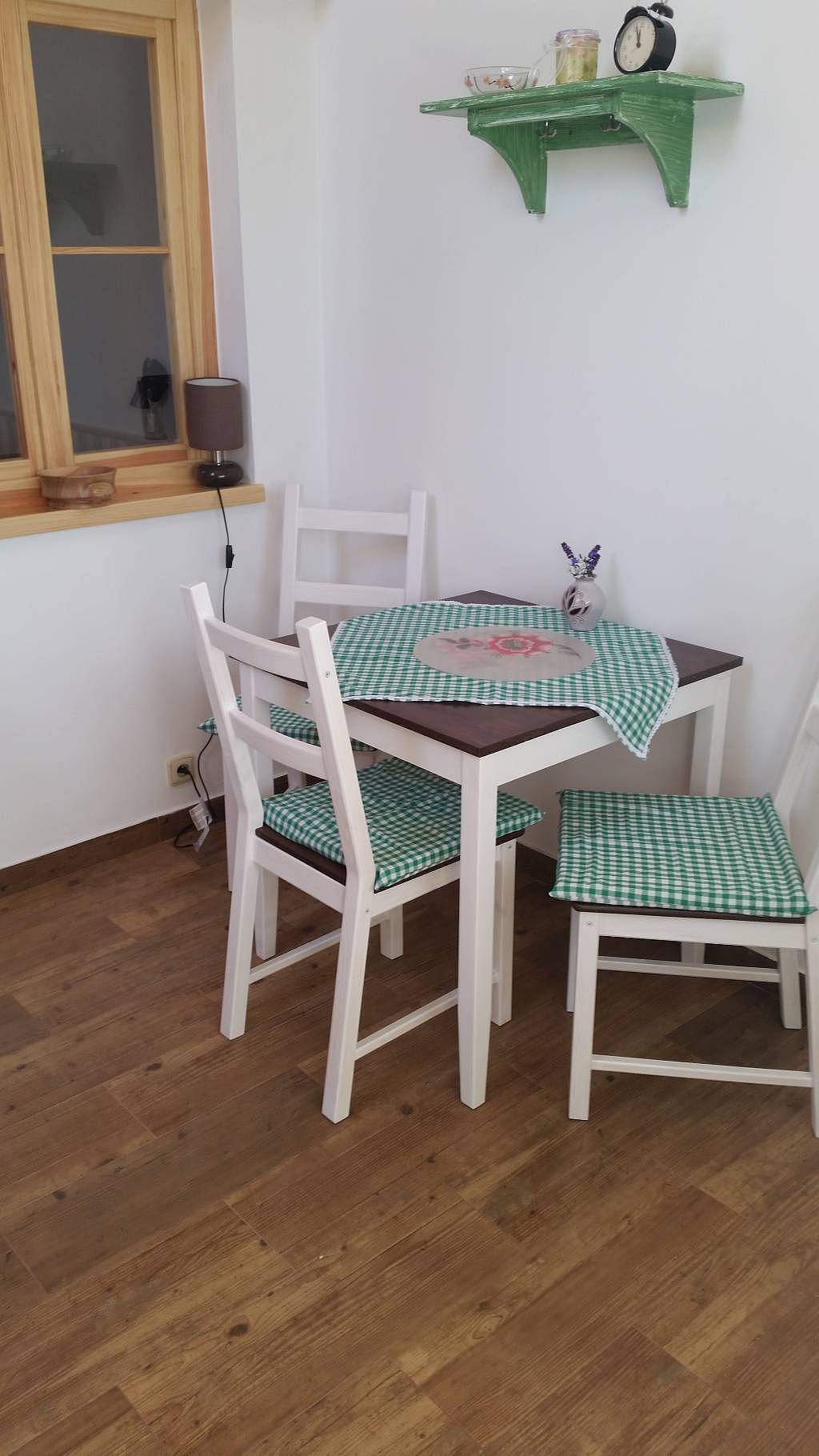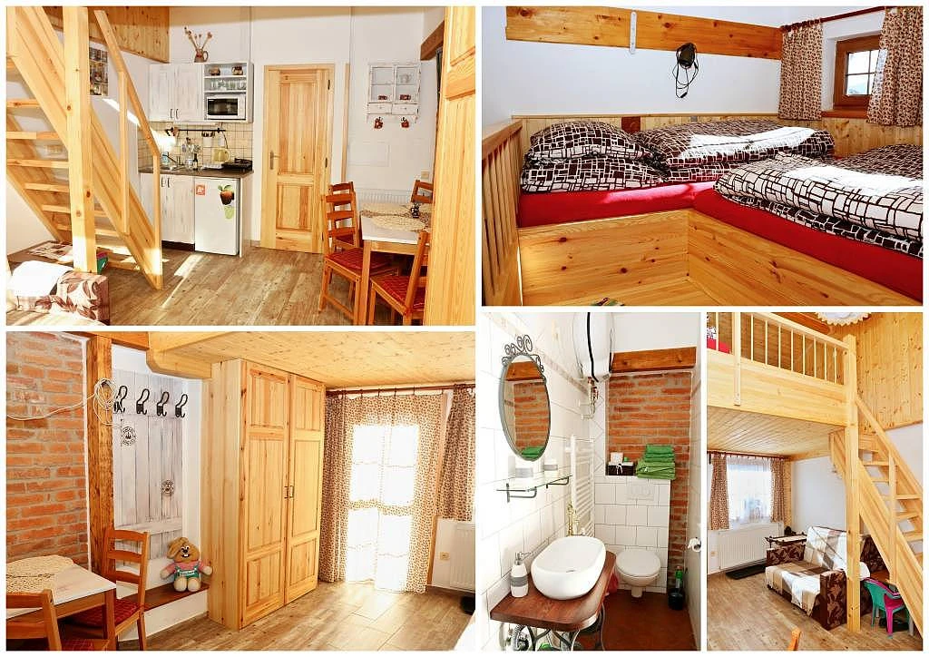 Každá jednotka má plně vybavenou kuchyňku (indukční vařič, lednice, mikrovlnná trouba, varná konvice, myčka, nádobí) a koupelnu se sprchovým koutem, umyvadlem, WC, fénem, toaletním papírem, ručníky a mýdlem. Vytápění je plynové. K dispozici je zdarma parkování u objektu a uzamykatelná úschovna kol a lyží. Noční klid platí od 22:00 do 7:00. Pro rezervace a cenové informace volejte 777 094 515.
