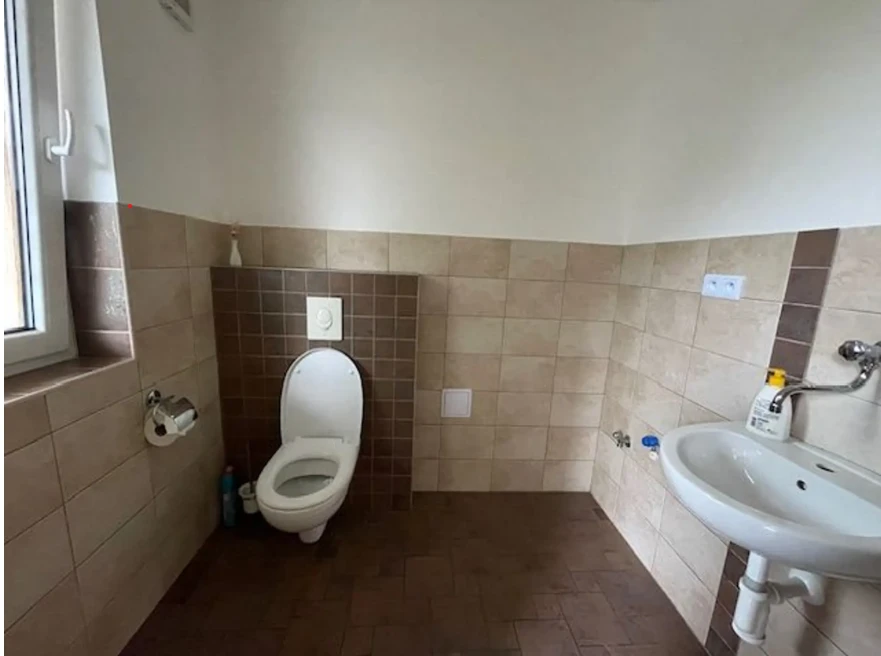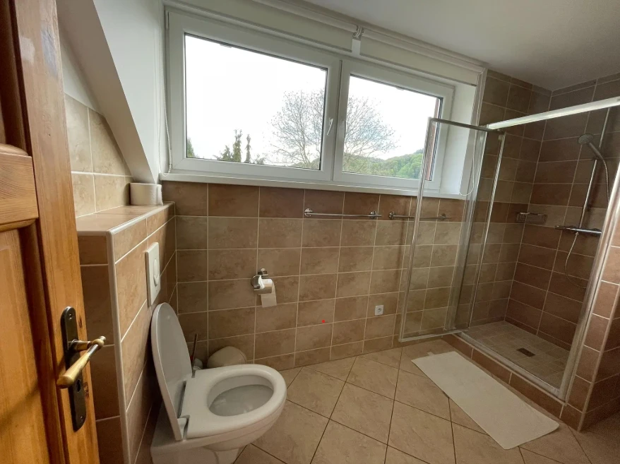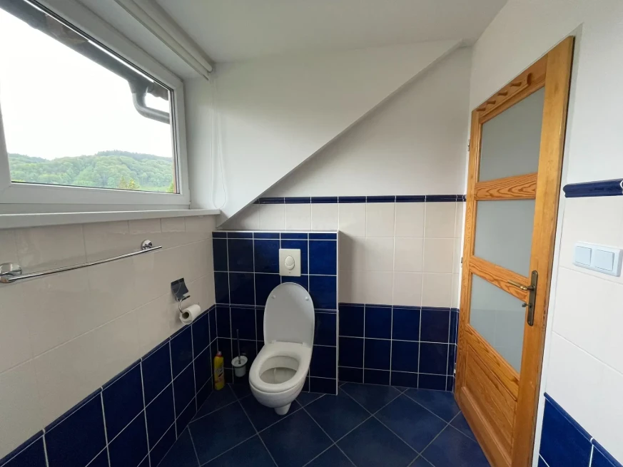 V podkroví se nachází koupelna se sprchovým koutem a toaletou, v přízemí je samostatná toaleta.