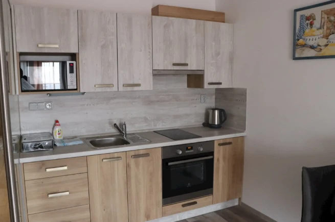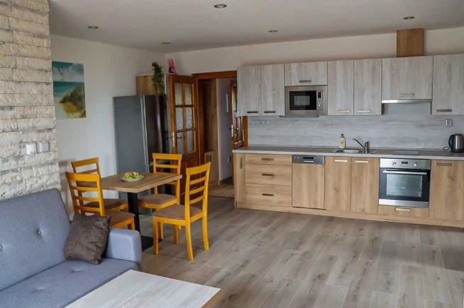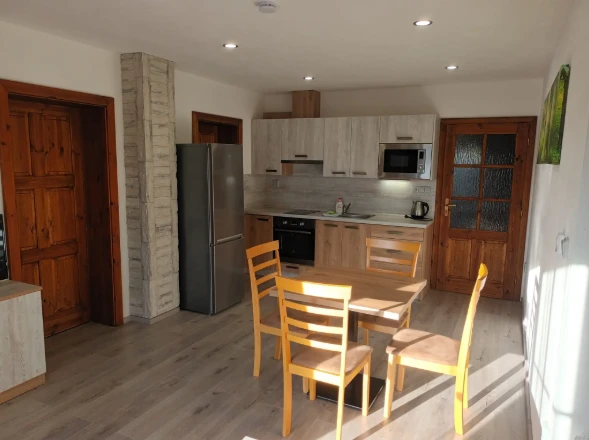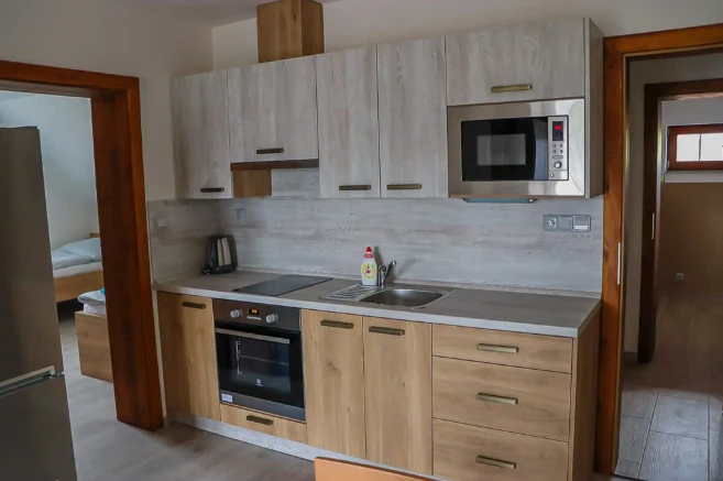Apartmány Na Vyhlídce v Horní Plané nabízejí ubytování pro 12 osob ve třech apartmánech. Každý apartmán má kuchyňský kout, obývací prostor, koupelnu, WiFi a venkovní posezení. Apartmán v přízemí je pro 2 osoby, apartmány v patře pro 5 osob (2 ložnice + přistýlka). Kuchyně obsahuje troubu, indukční desku, mikrovlnku, lednici a rychlovarnou konvici. K dispozici je úschovna kol, místnost pro kočárky a parkování u objektu.