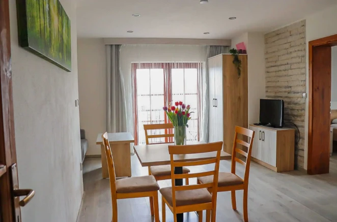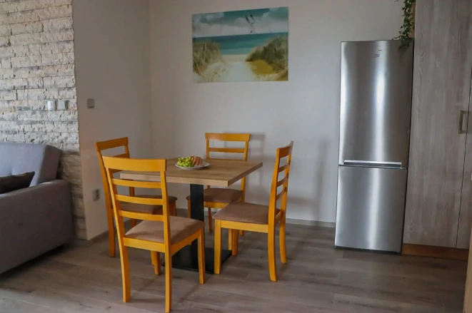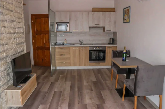 První apartmán se nachází v přízemí a je určen pro dvě osoby. Má manželskou postel a terasu. Druhý a třetí apartmán jsou umístěny v prvním patře, každý s kapacitou pěti osob. Oba disponují balkónem, manželskou postelí v první ložnici, dvěma samostatnými lůžky ve druhé ložnici a možností přistýlky na rozkládací pohovce v obývacím prostoru.