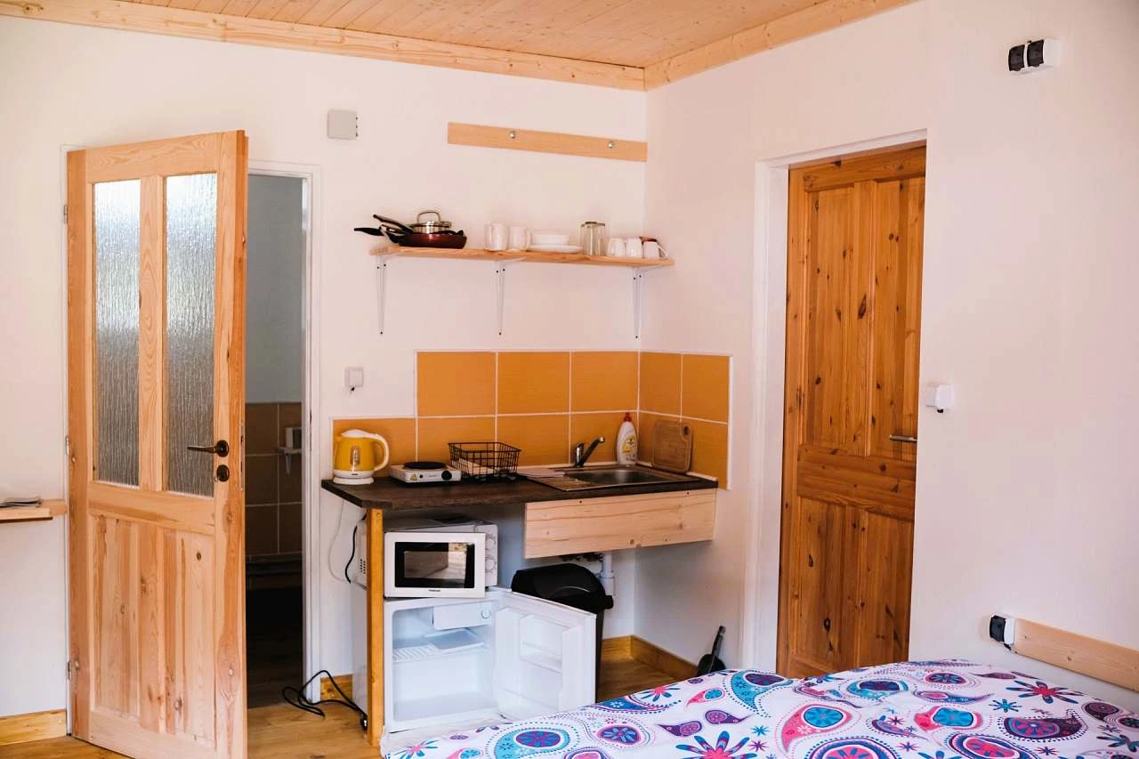 Kuchyňský kout je vybaven hotelovou lednicí, rychlovarnou konvicí, vařičem, mikrovlnkou a potřebným nádobím.