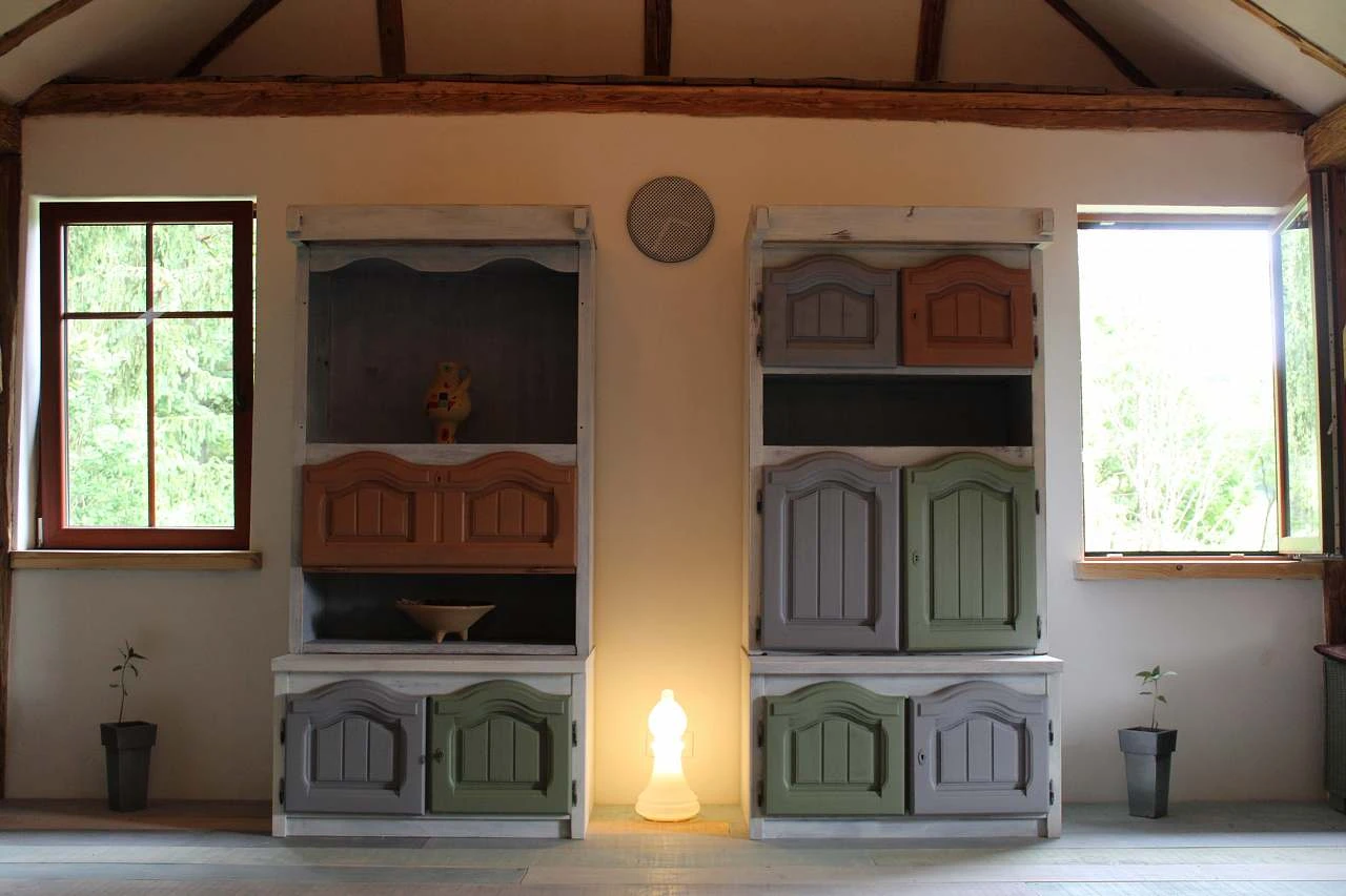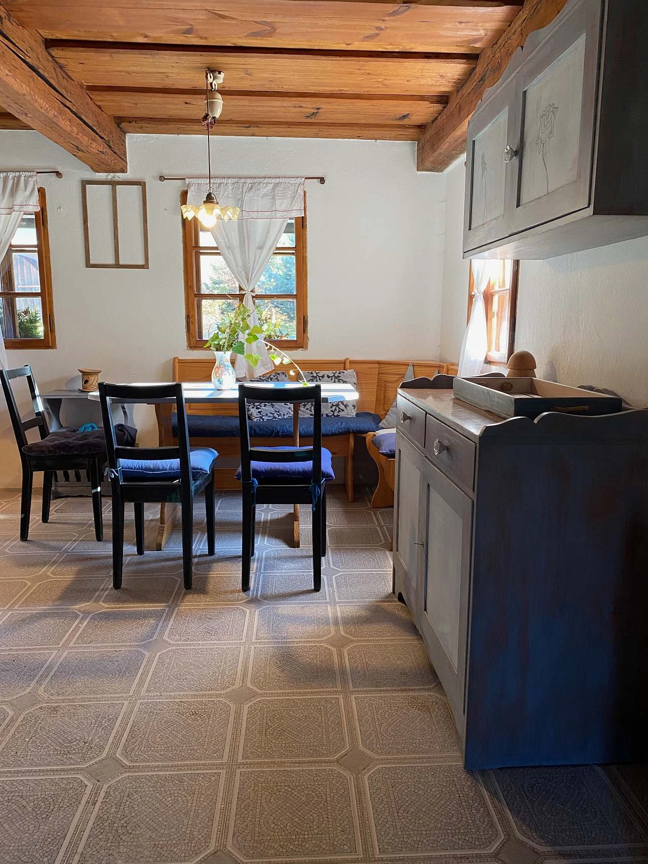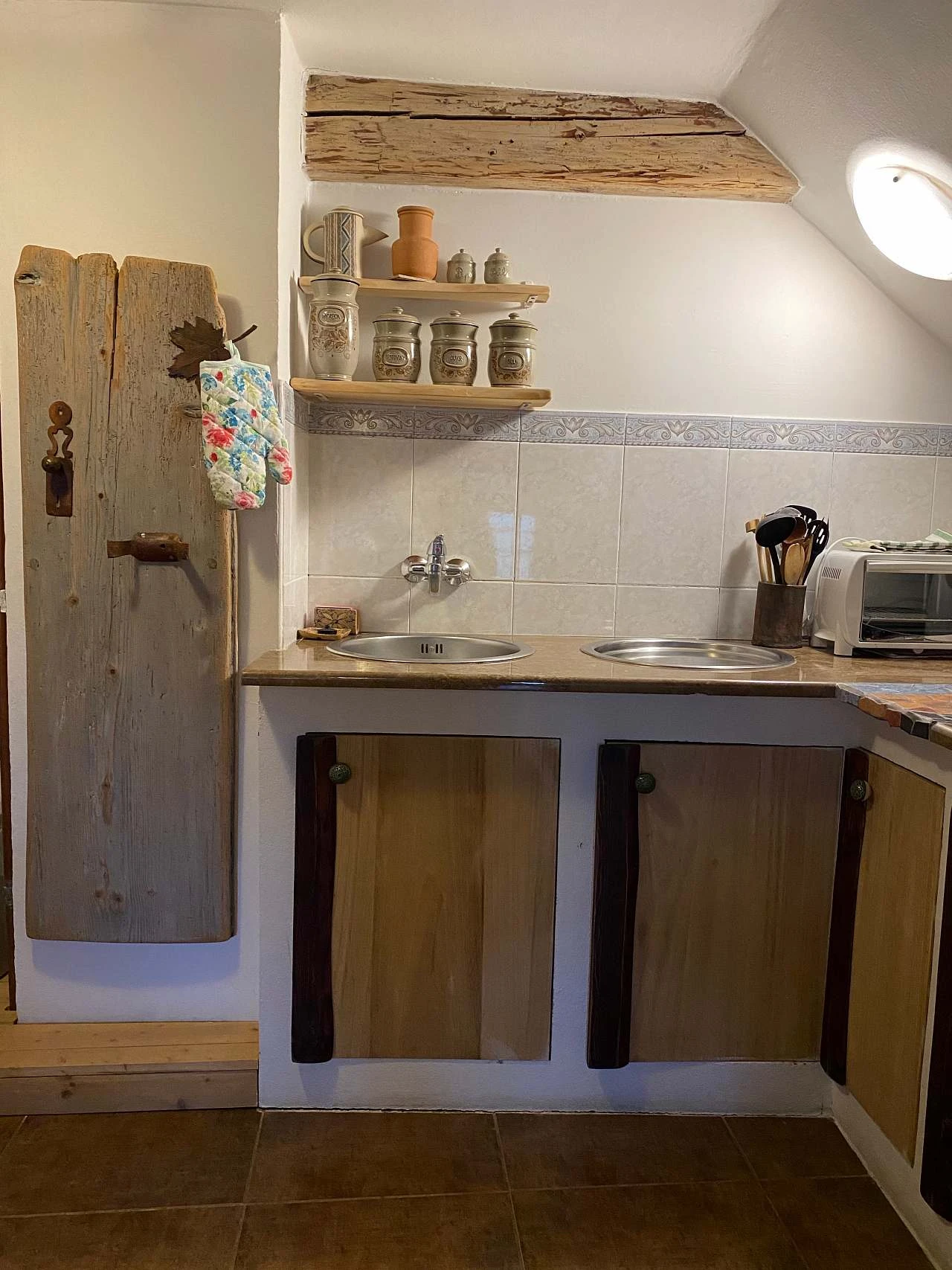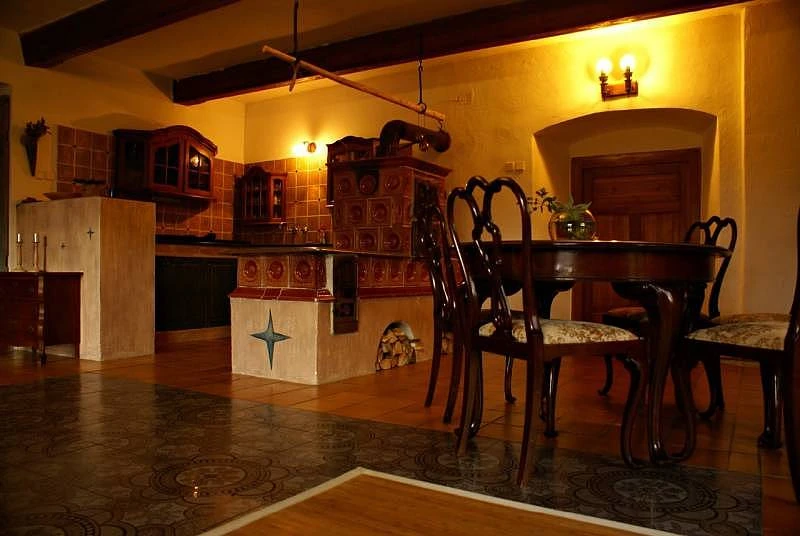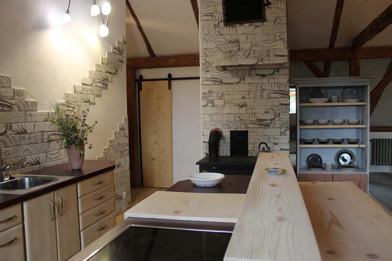 - Kuchyň: velkorysá kuchyň s vysokým stropem a krbovými kamny. Plně vybavená kuchyň zahrnuje lednici, rychlovarnou konvici, mikrovlnnou troubu a vařič.