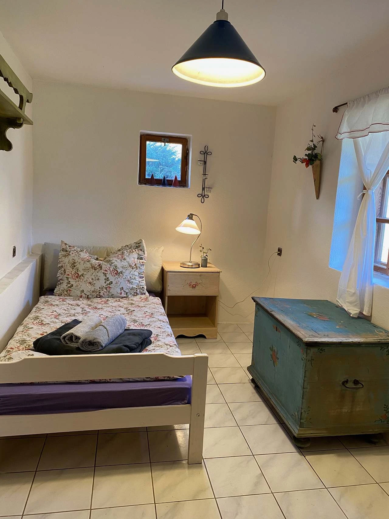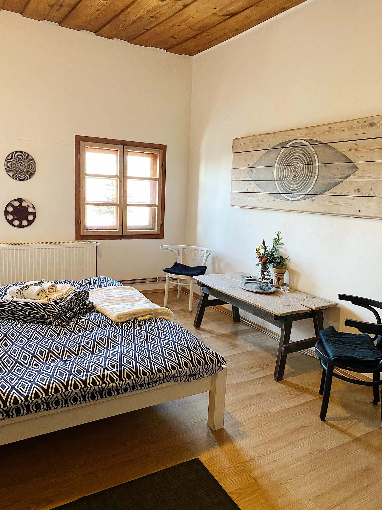 - Velká místnost s 2 zavěšenými manželskými postelemi a dětským dřevěným autíčkem na spaní, okna situovaná na západ.