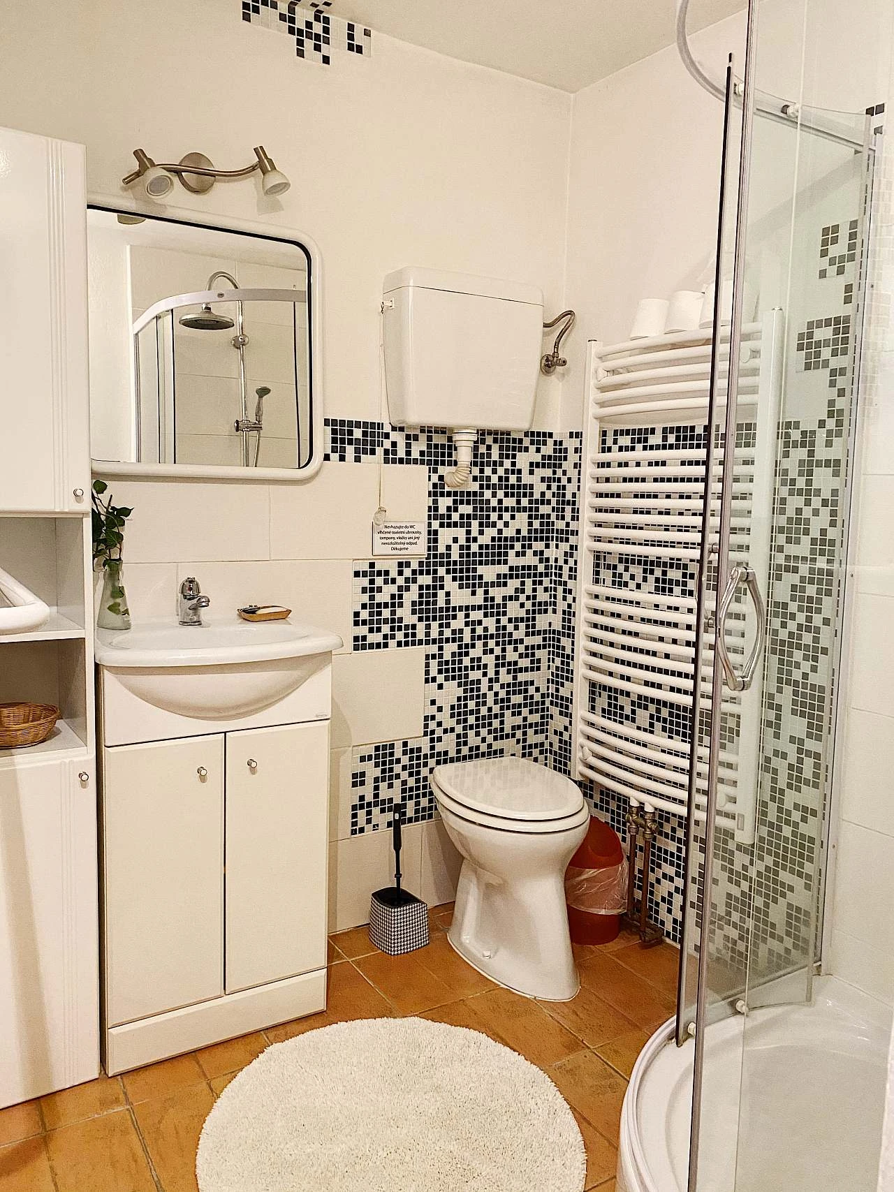 - Koupelna: soukromá koupelna se sprchovým koutem a WC, která se nachází vedle kuchyně.