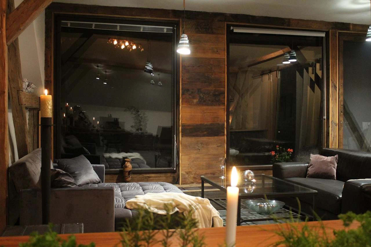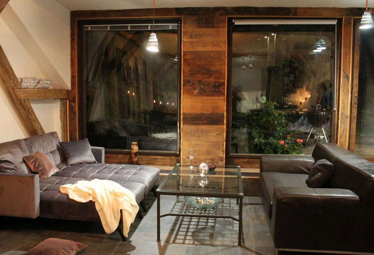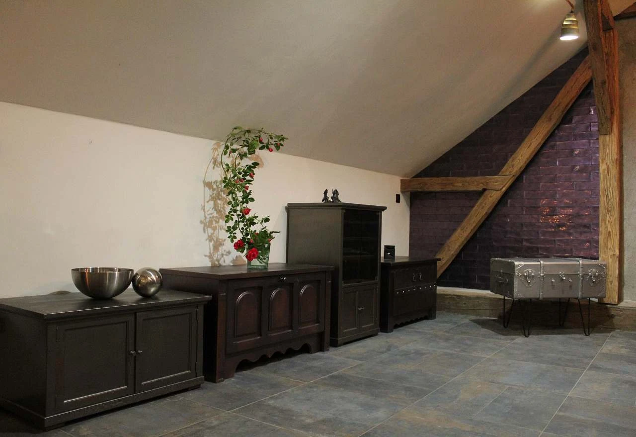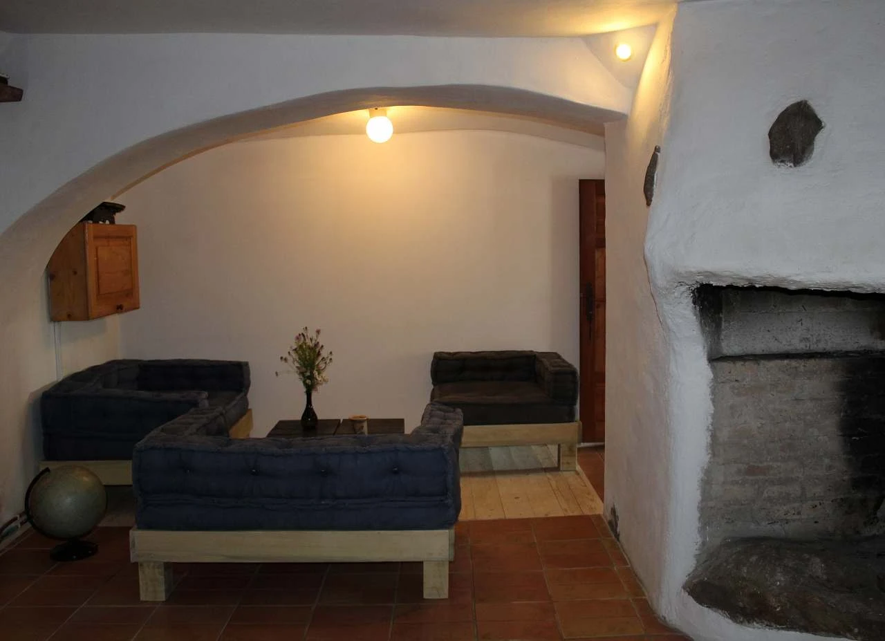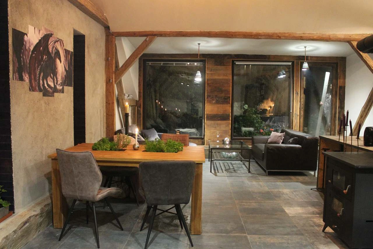 - Obývací prostor: posezení u krbu a kamna pro příjemnou atmosféru.