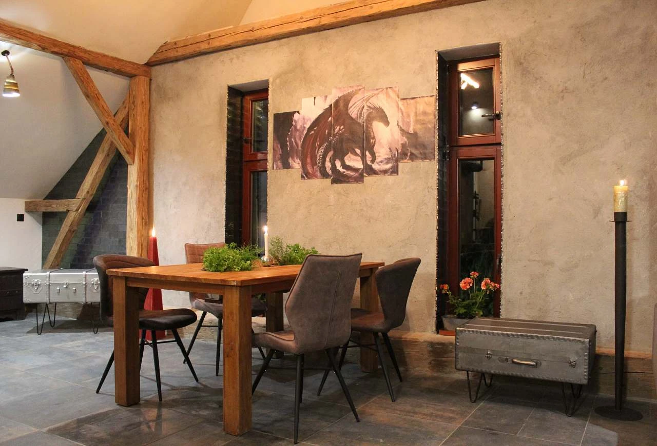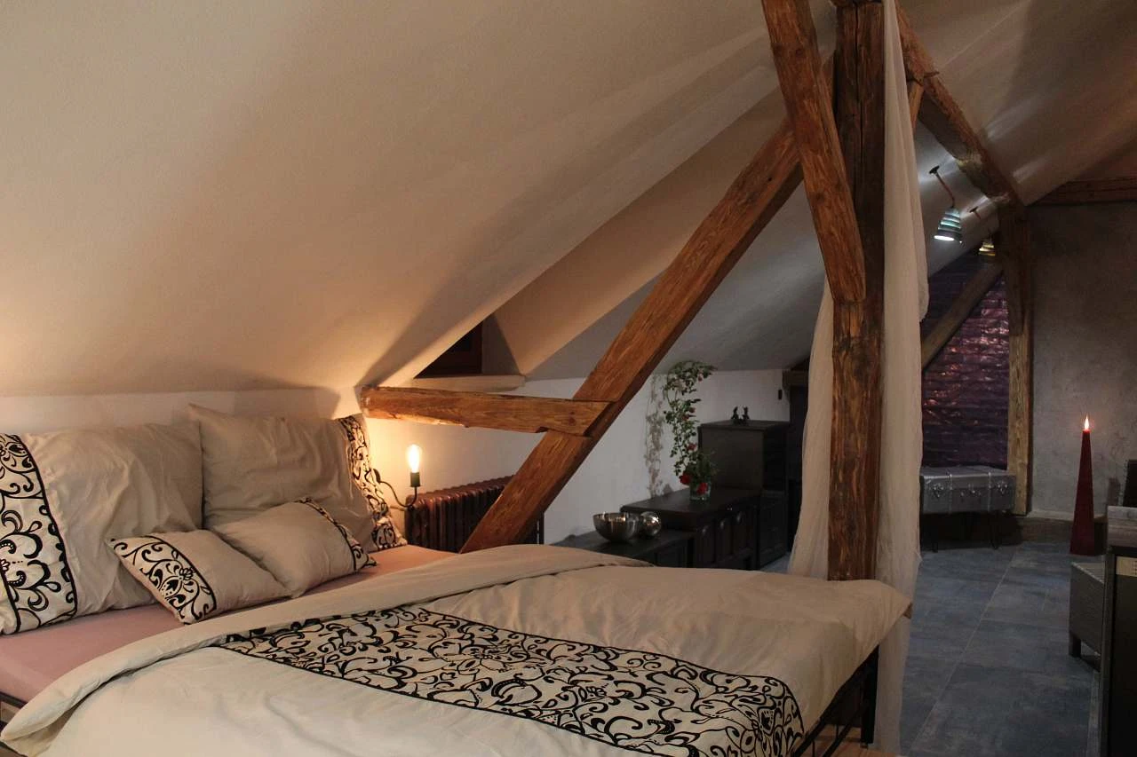 Apartmán Baba Jaga o velikosti 1+kk (50 m²) je ideální volbou pro pár nebo tvůrčího jedince, který hledá klid a inspirativní prostředí. Díky své poloze nad stájemi a samostatnému vchodu přes terasu nabízí největší míru soukromí ze všech apartmánů.