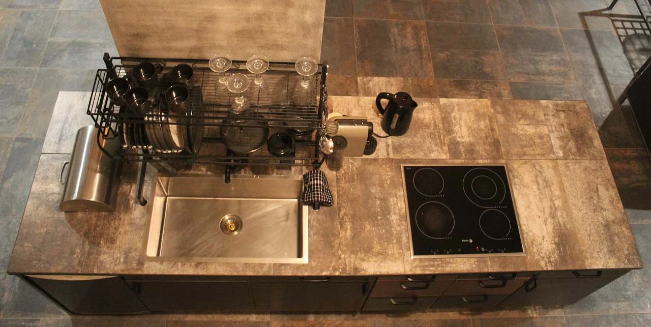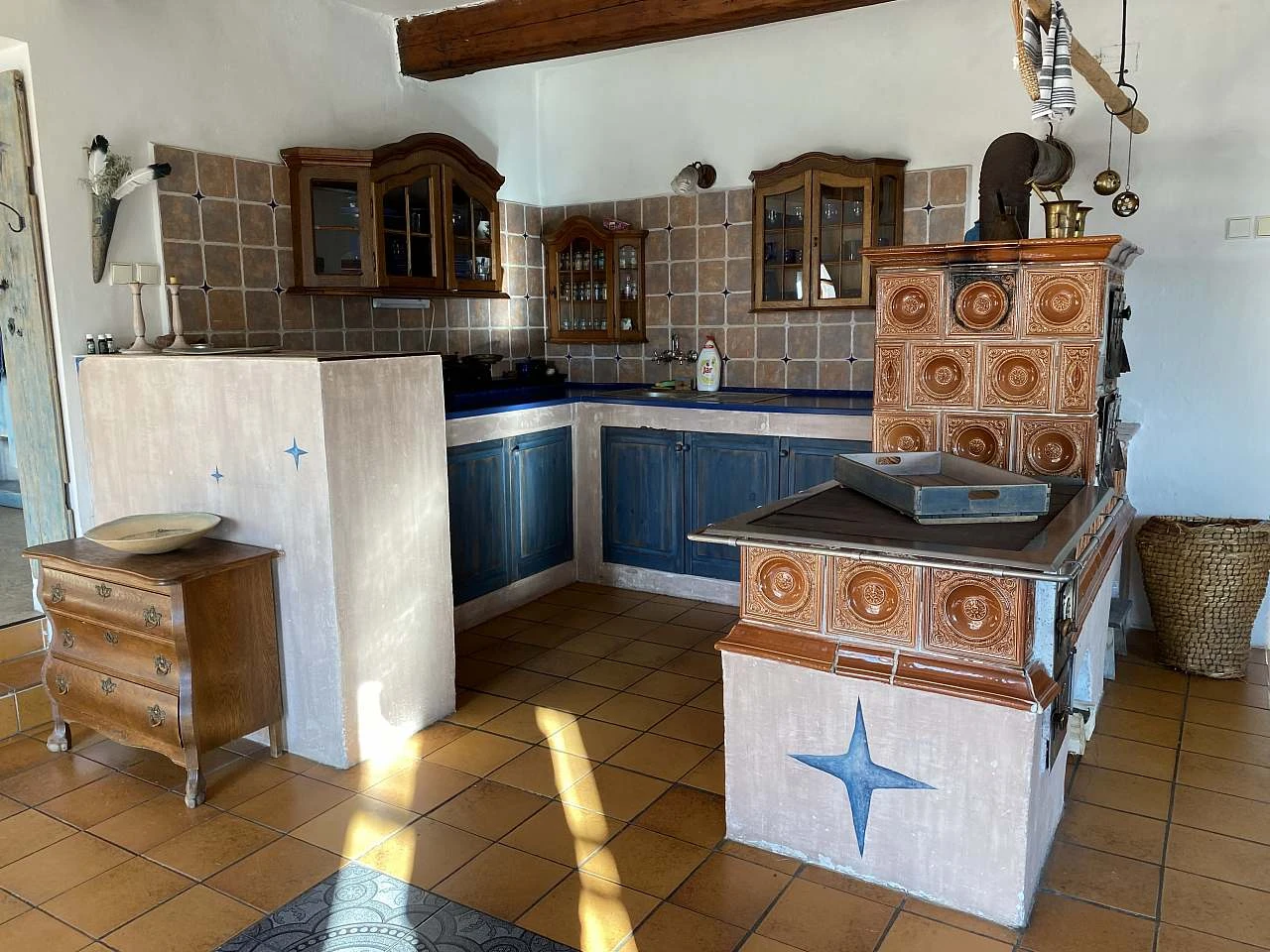 - Kuchyň: plně vybavená kuchyň s kuchyňským ostrůvkem, kamny na dřevo a velkým úložným prostorem na potraviny s lednicí.