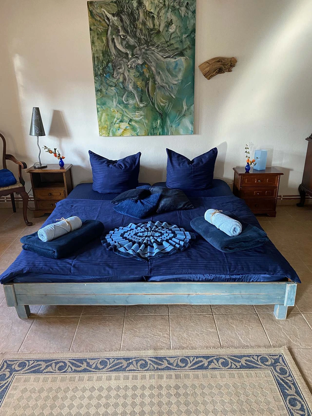 Modrý apartmán se nachází v přízemí chalupy a nabízí soukromý vchod, terasu s grilem a výhled do zahrady. Tento apartmán o velikosti 2+kk (70 m²) je ideální pro dvojici, rodinu nebo skupinu přátel. Vybavení apartmánu: Kapacita: 2–4 osoby (+ možnost 2 přistýlek). Ložnice: Velký obývací pokoj propojený s ložnicí, kde se nachází manželská postel a vířivá vana ve výklenku. Místnost s krbem, která může sloužit jako druhá ložnice nebo místo pro večerní posezení. Kuchyň: plně vybavená kuchyň zahrnující lednici, rychlovarnou konvici, mikrovlnnou troubu, vařič a kachlový sporák pro případné vytápění. Koupelna: soukromá koupelna se sprchovým koutem a WC. Terasa: soukromá terasa s grilem a posezením. Design: apartmánu dominuje noblesní modrá barva, která vytváří jedinečnou atmosféru. Další informace: Apartmán je vhodný pro pobyt s domácími mazlíčky – pejsci jsou vítáni, včetně větších plemen. Samostatný vchod zajišťuje maximální soukromí. Ceník: Cena za 1 noc: 4 osoby: 3 000 Kč 2 osoby: 2 000 Kč Týdenní pobyt: 4 osoby: 18 900 Kč 2 osoby: 12 600 Kč