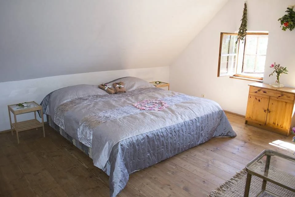 Nadpozemský apartmán je největším apartmánem v hlavní chalupě a nachází se v 1. nadzemním podlaží. Tento apartmán o velikosti 2+1 (70 m²) je ideální volbou pro rodiny s dětmi nebo více generací. Vybavení apartmánu: Kapacita: až 7 osob. Ložnice: Samostatná ložnice s manželskou postelí a oknem orientovaným na sever. Velká místnost s 2 zavěšenými manželskými postelemi a dětským dřevěným autíčkem na spaní, okna situovaná na západ. Obývací prostor: sedací souprava ve velké místnosti. Kuchyň: velkorysá kuchyň s vysokým stropem a krbovými kamny. Plně vybavená kuchyň zahrnuje lednici, rychlovarnou konvici, mikrovlnnou troubu a vařič. Koupelna: soukromá koupelna se sprchovým koutem a WC, která se nachází vedle kuchyně. Design: apartmán vyniká svým prostorem a jedinečnými zavěšenými postelemi, které zaručují nezapomenutelný zážitek. Další informace: Apartmán je vhodný pro pobyt s domácími mazlíčky – pejsci jsou vítáni. Díky oddělené ložnici je apartmán ideální i pro více generací. Ceník: Cena za 1 noc: 6 osob: 3 500 Kč 4 osoby: 2 600 Kč 2 osoby: 1 700 Kč Týdenní pobyt: 6 osob: 22 000 Kč 4 osoby: 16 400 Kč 2 osoby: 10 700 Kč