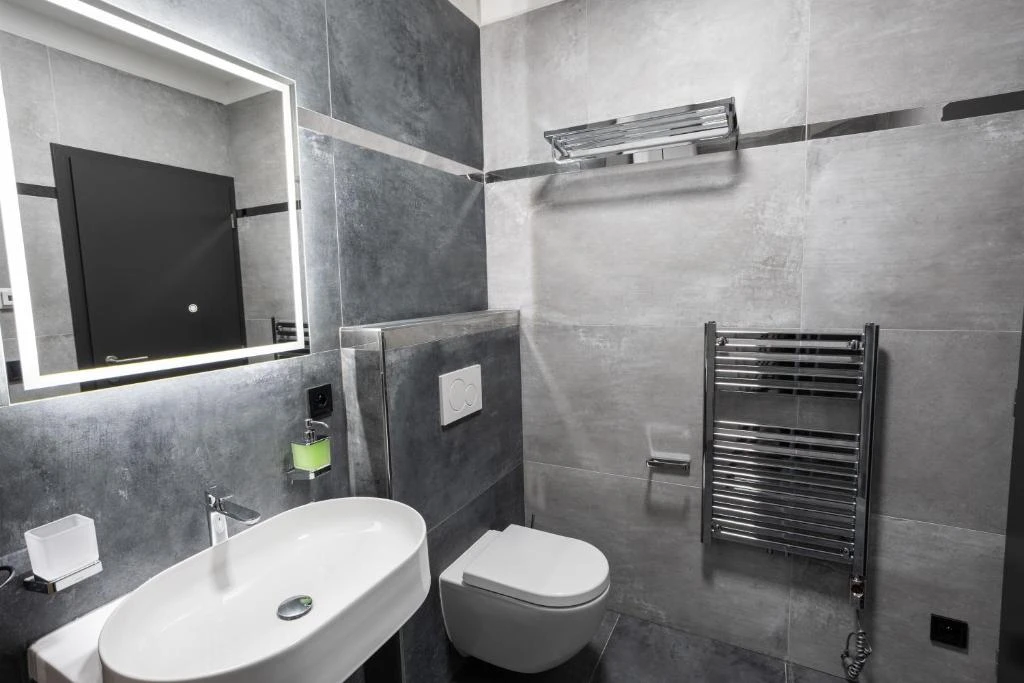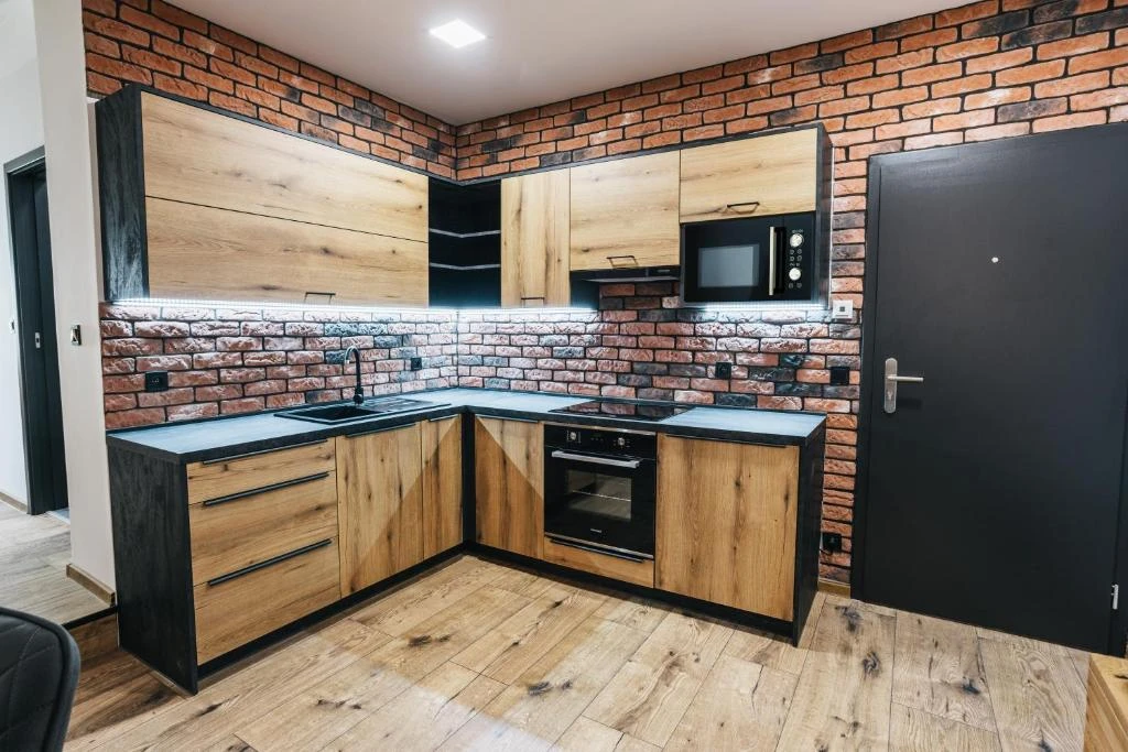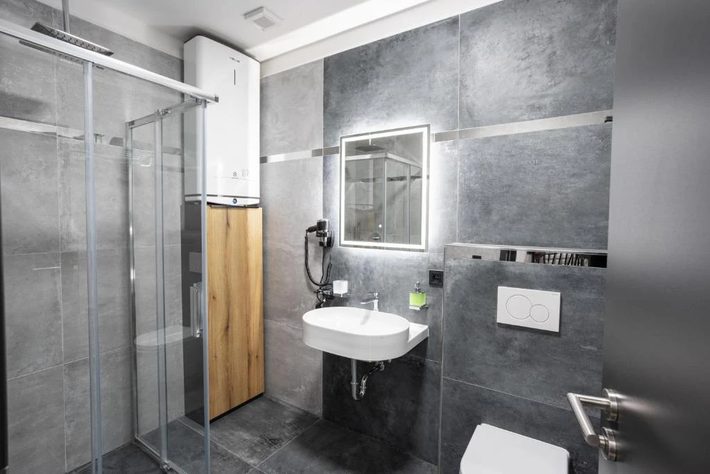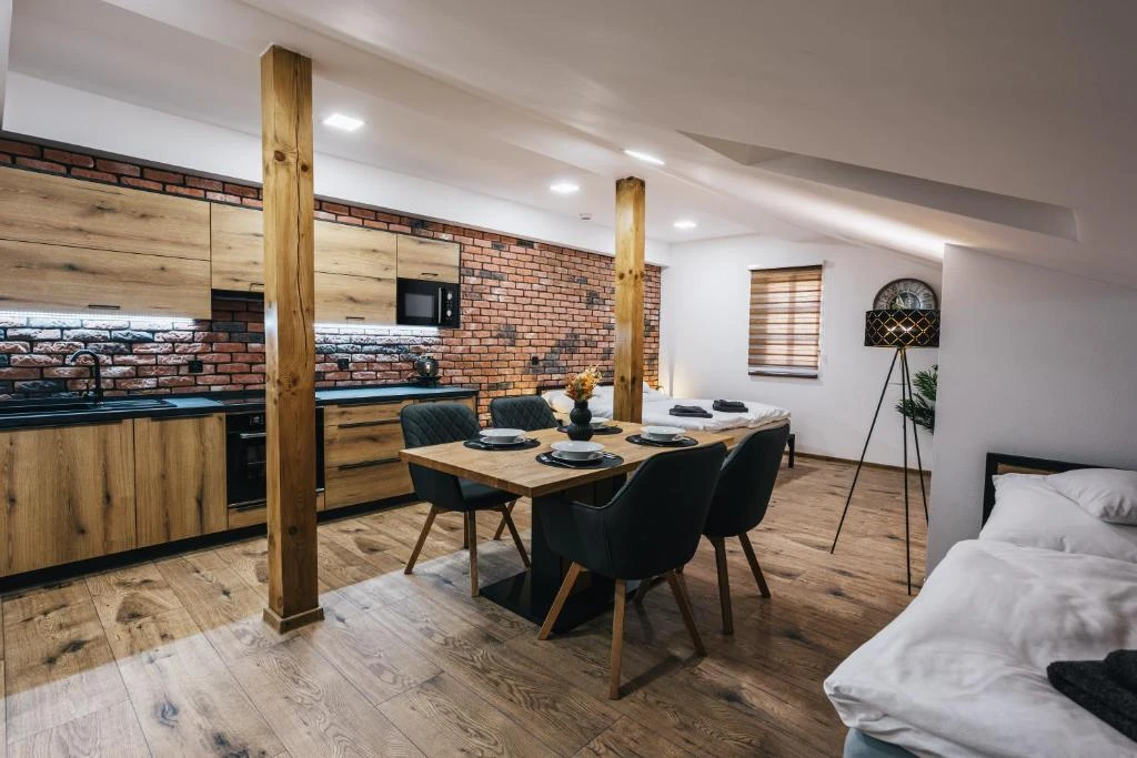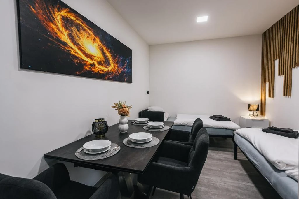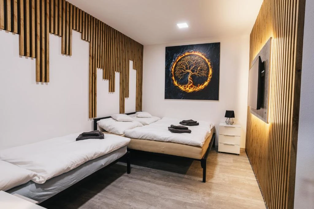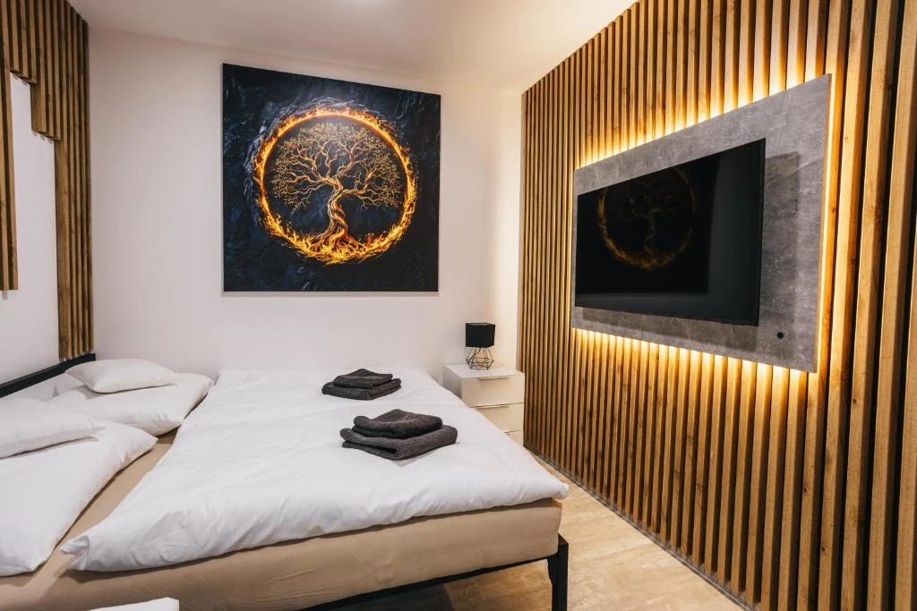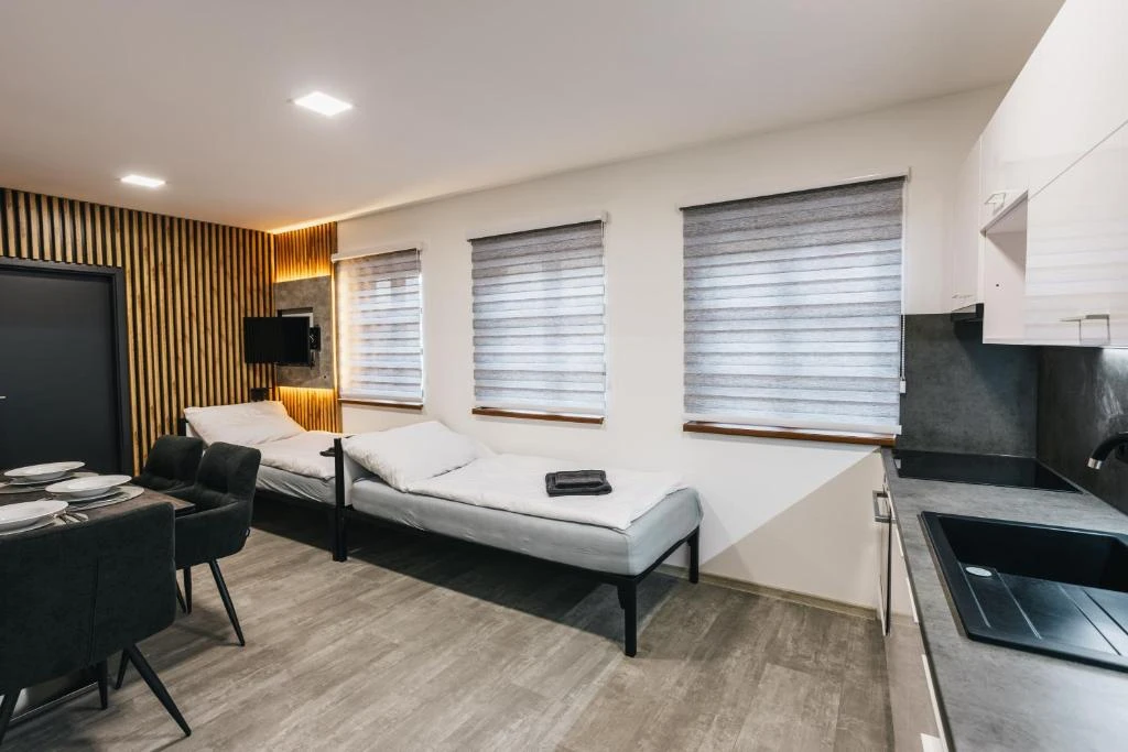 Každý apartmán je vybaven plně zařízenou kuchyní, která obsahuje jídelní stůl, varnou desku, troubu, kuchyňské potřeby, rychlovarnou konvici, myčku nádobí, mikrovlnnou troubu a lednici. Ložnice zahrnují povlečení, skříň nebo šatnu a zvláště dlouhé postele. V koupelně je sprcha, toaleta, ručníky, toaletní papír a fén. V každém apartmánu je také k dispozici sušák na prádlo.