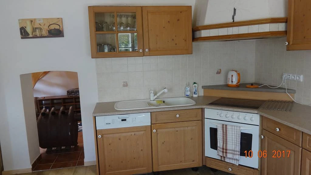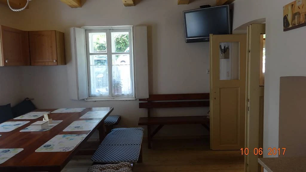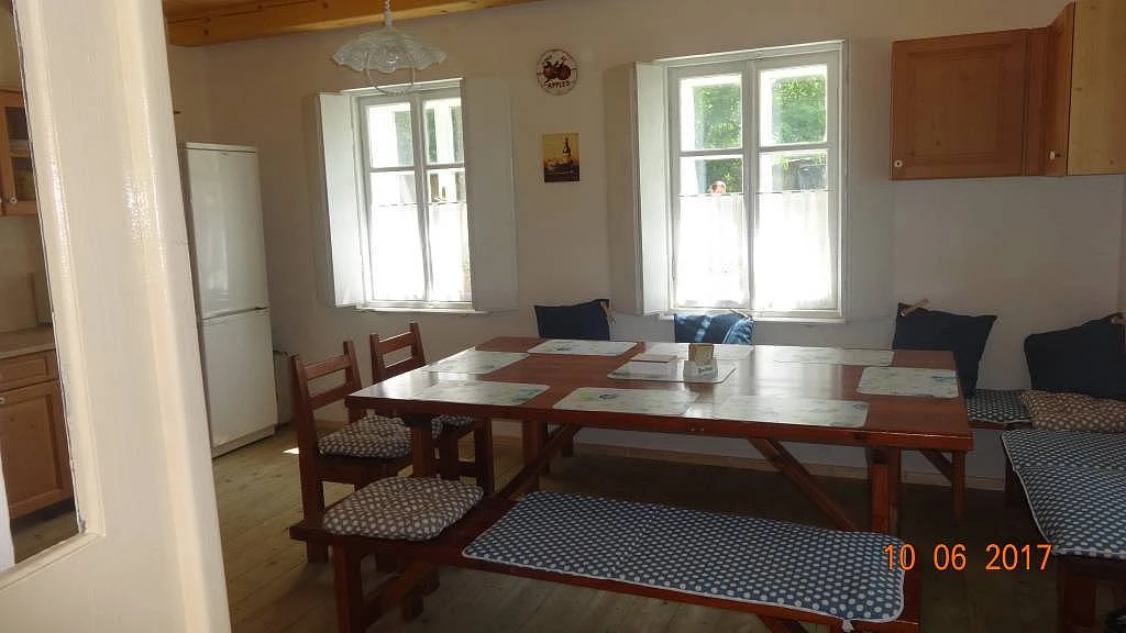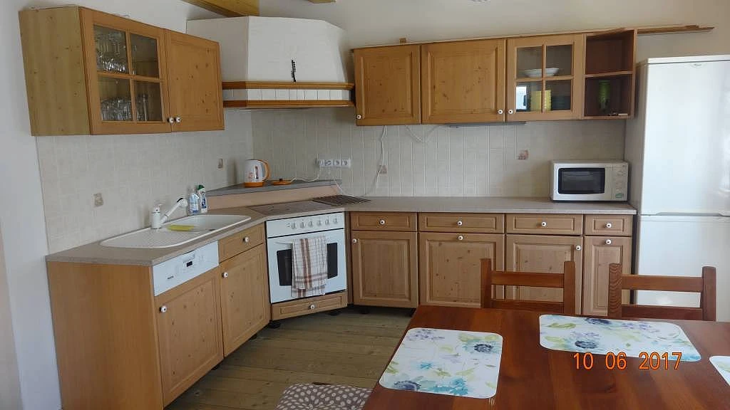 Obytná kuchyň s jídelní stolem pro 12 osob a TV se satelitem. Kuchyň je vybavena sklokeramickou deskou, el. troubou, rychlovarnou konvicí, mikrovlnkou, myčkou a velkou lednicí s mrazákem.