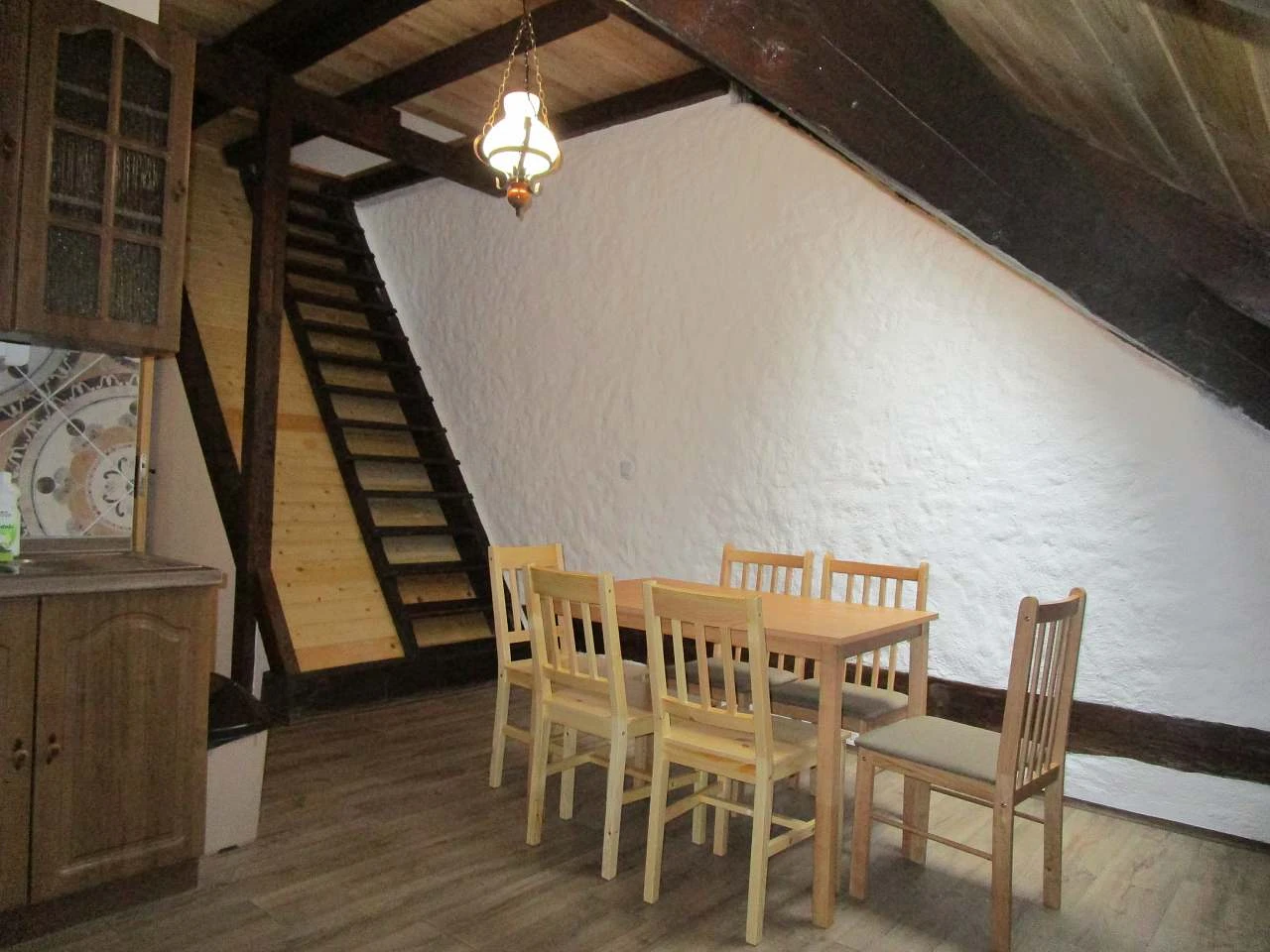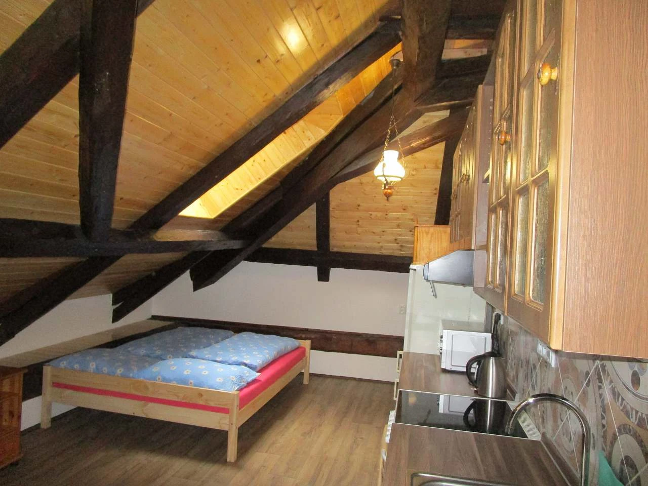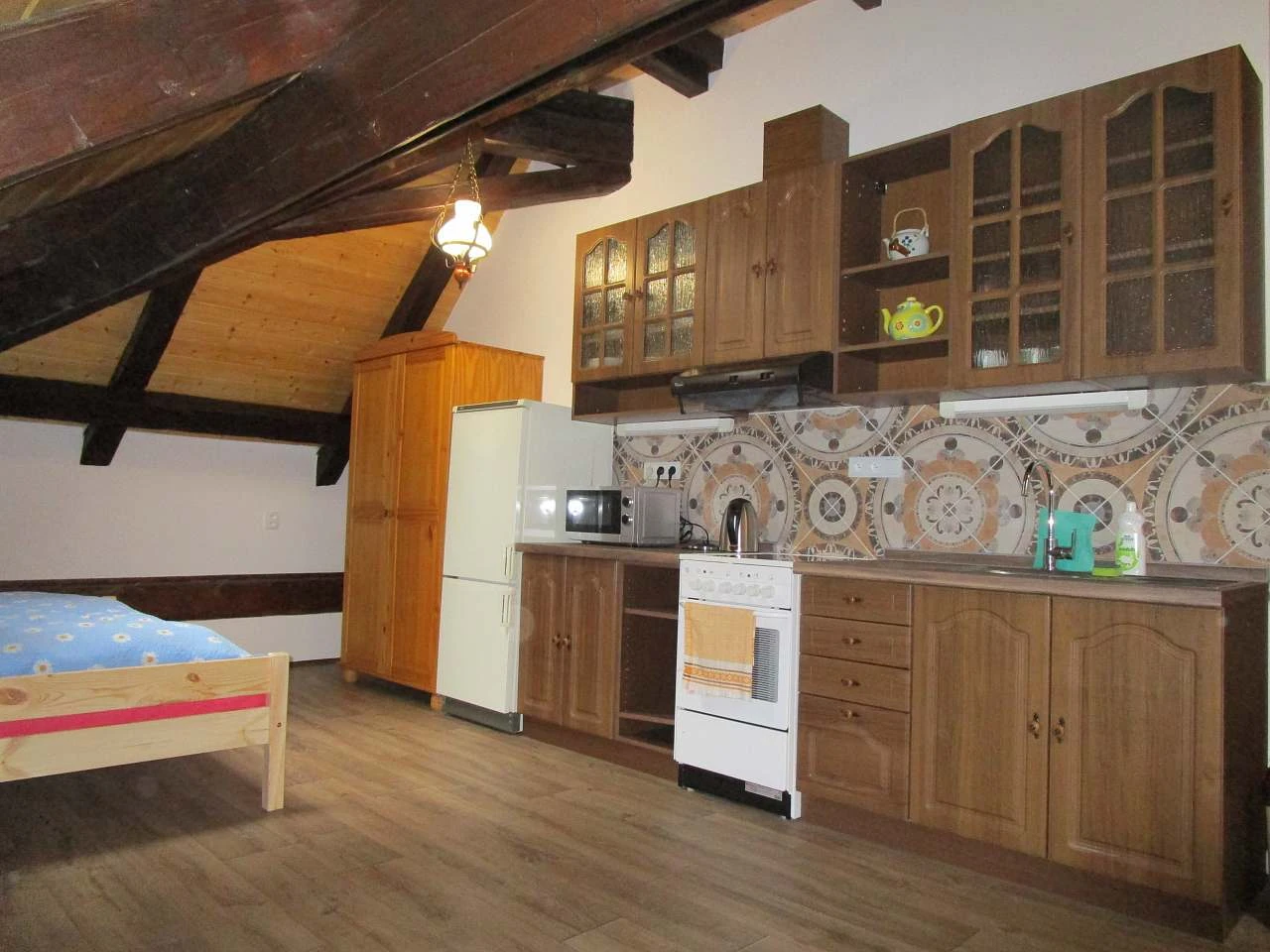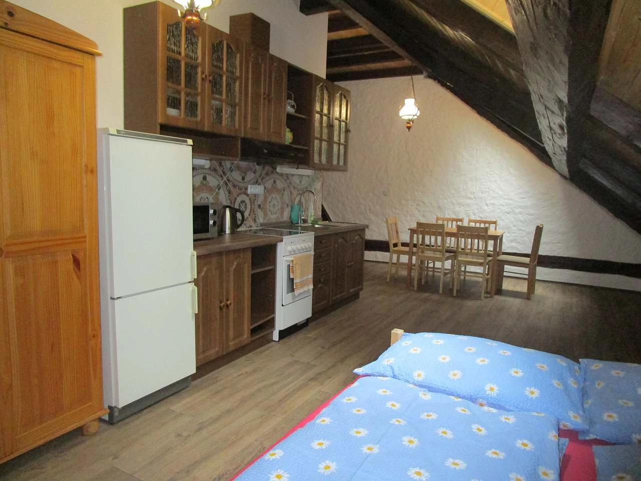 6 lůžkový apartmán s kuchynkou - mezonet, 2lůžka dole, schodiště a 4 lůžka nahoře, lednice, mikrovlná trouba, sklokeramická varná deska 4 plotýnky, elektrická trouba, nádobí atd.