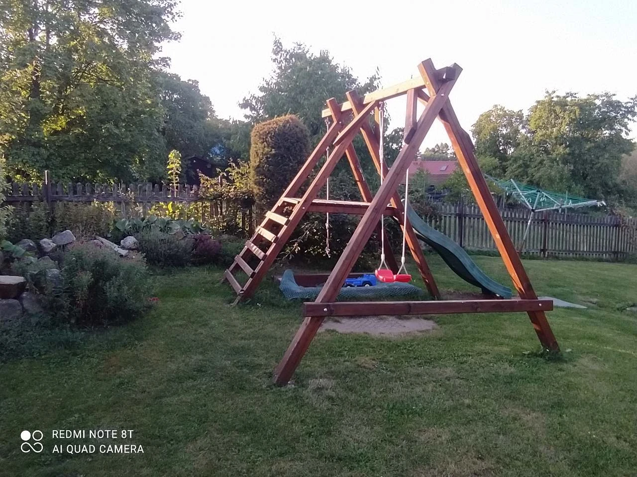 Venkovní posezení, ohniště, pískoviště, houpačka, skluzavka.