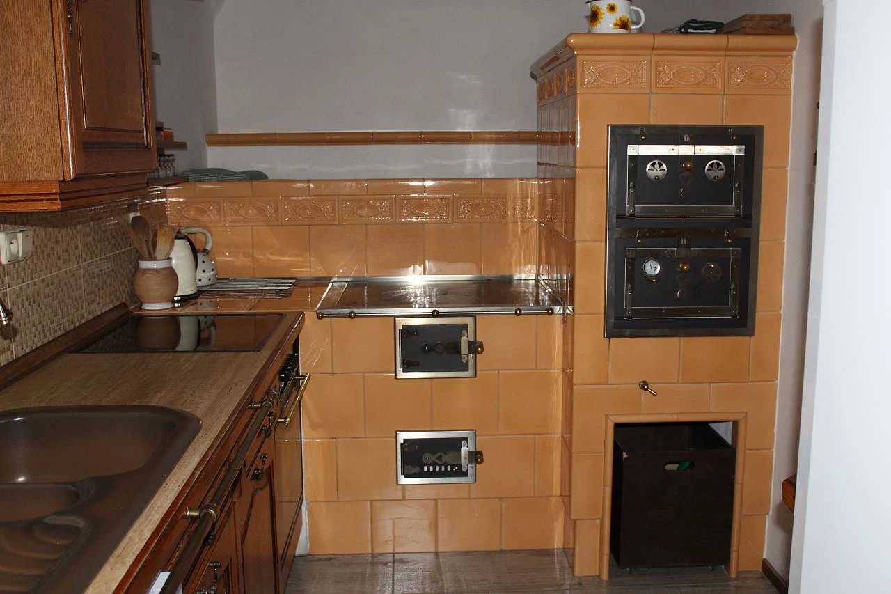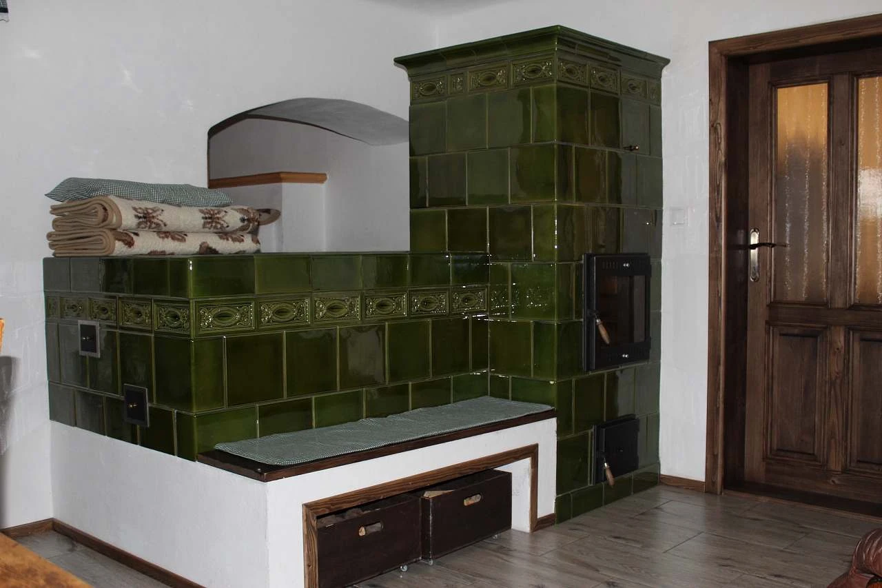 Vytápění: Kachlová kamna napojená na ústřední topení. Kuchyně má kachlový sporák se dvěma troubami.