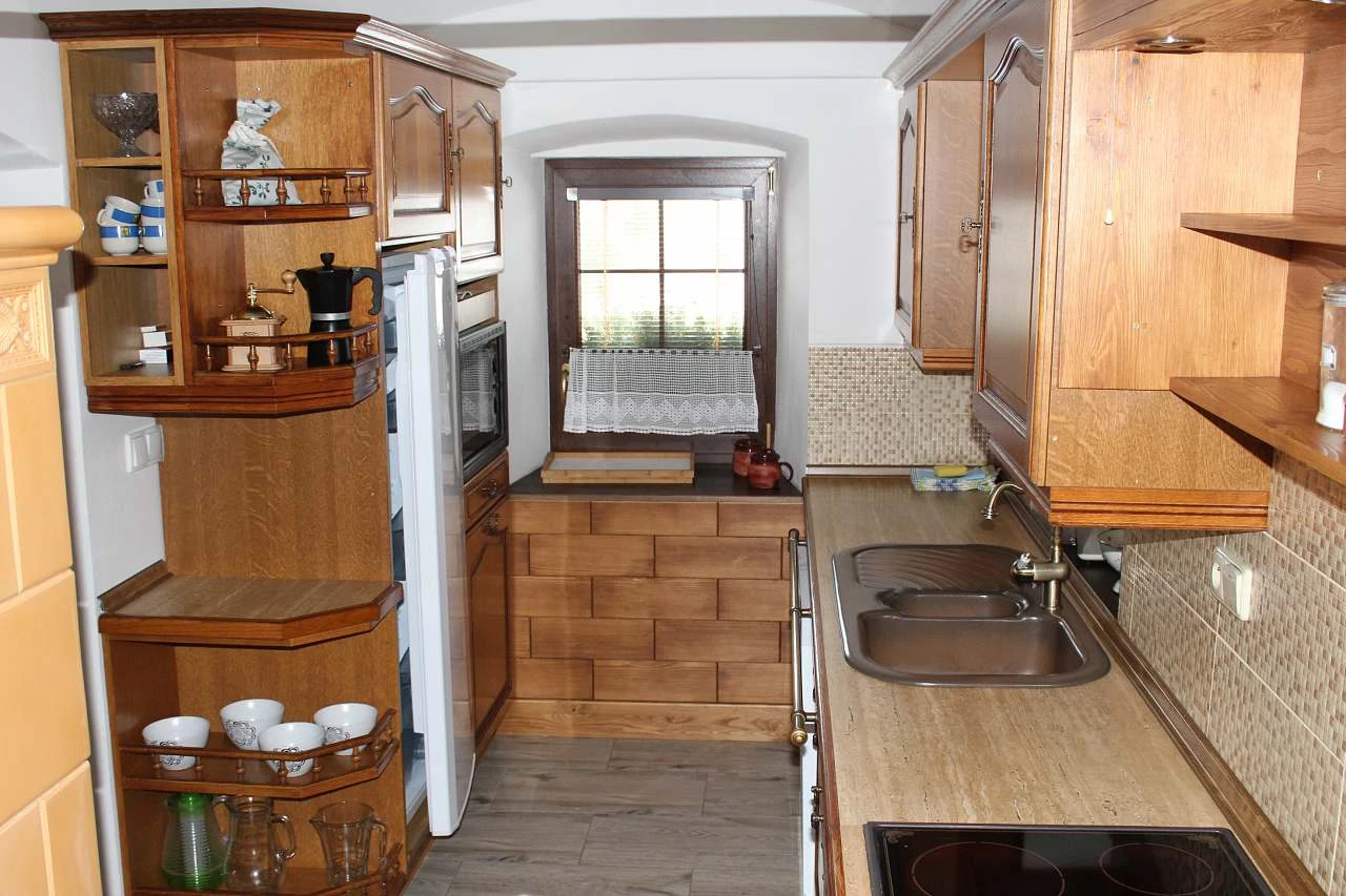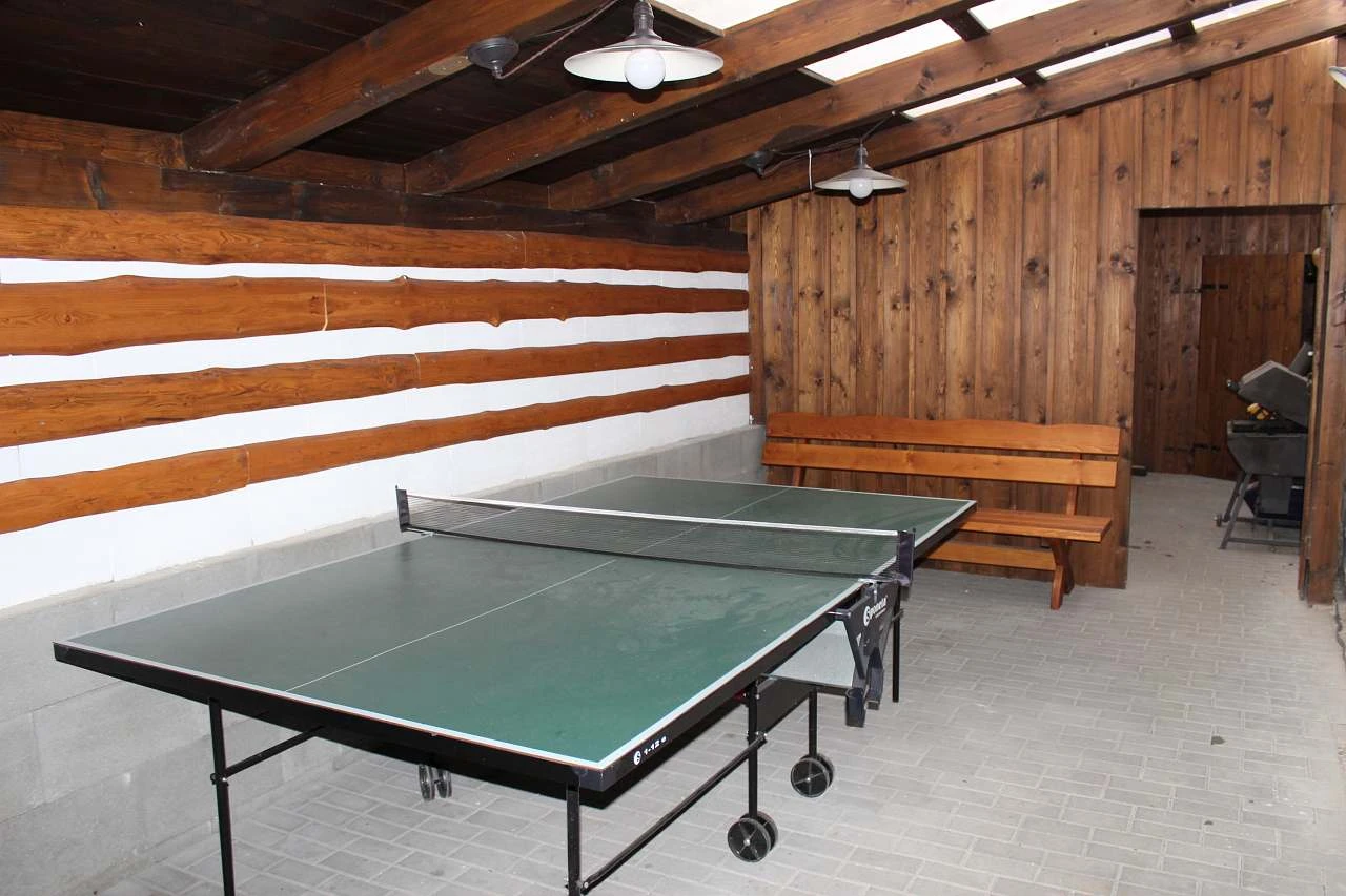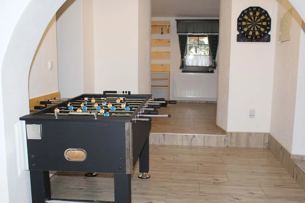 kachlová kamna, kachlový sporák, elektrický sporák, trouba, mikrovlnná trouba, myčka, tři lednice s mrazákem, toustovač, topinkovač, kuchyňský robot, varná konvice, stolní fotbálek, elektrické šipky, stolní tenis, infrasauna, horký sud, plynový gril, venkovní hřiště, pískoviště