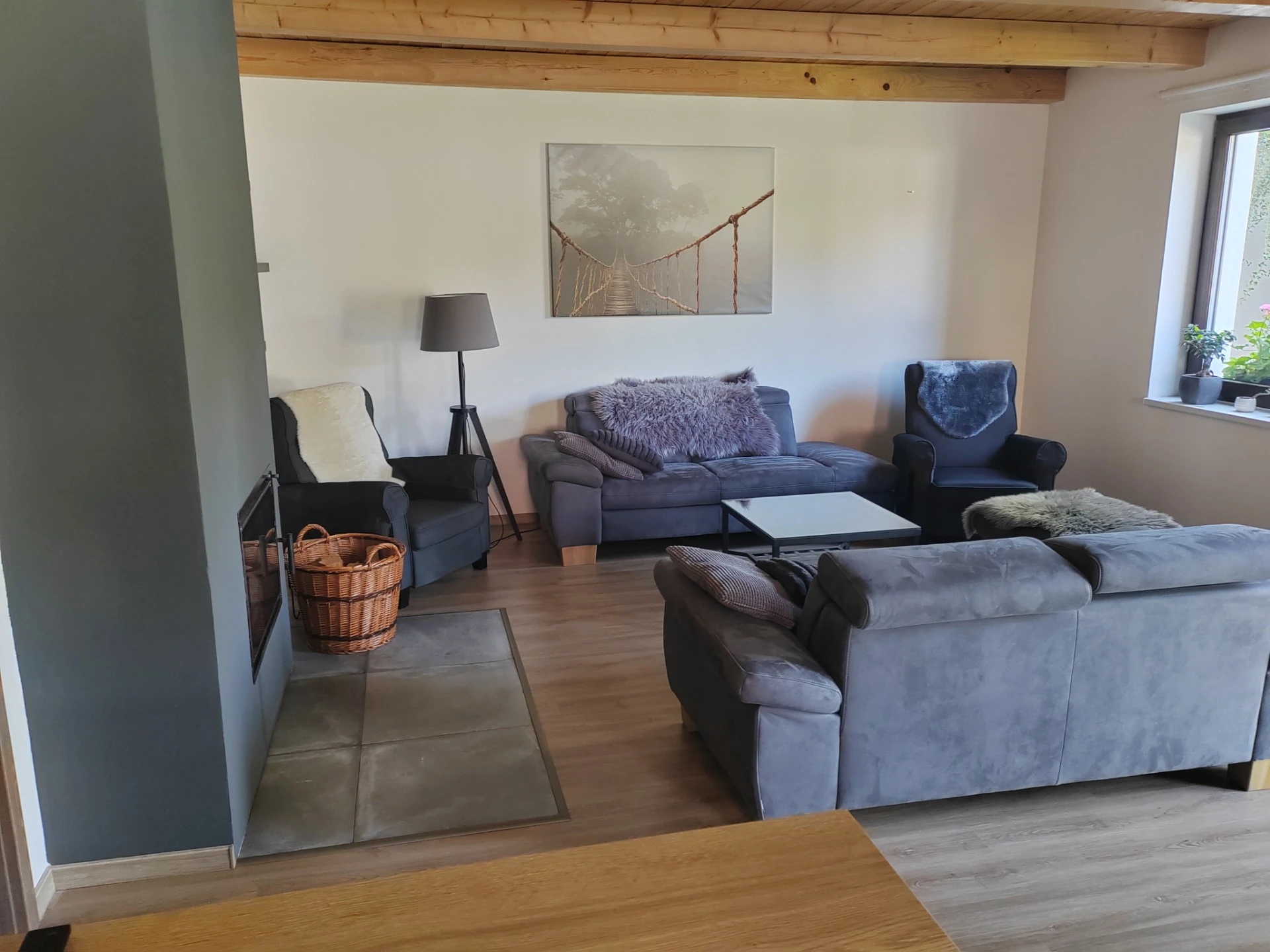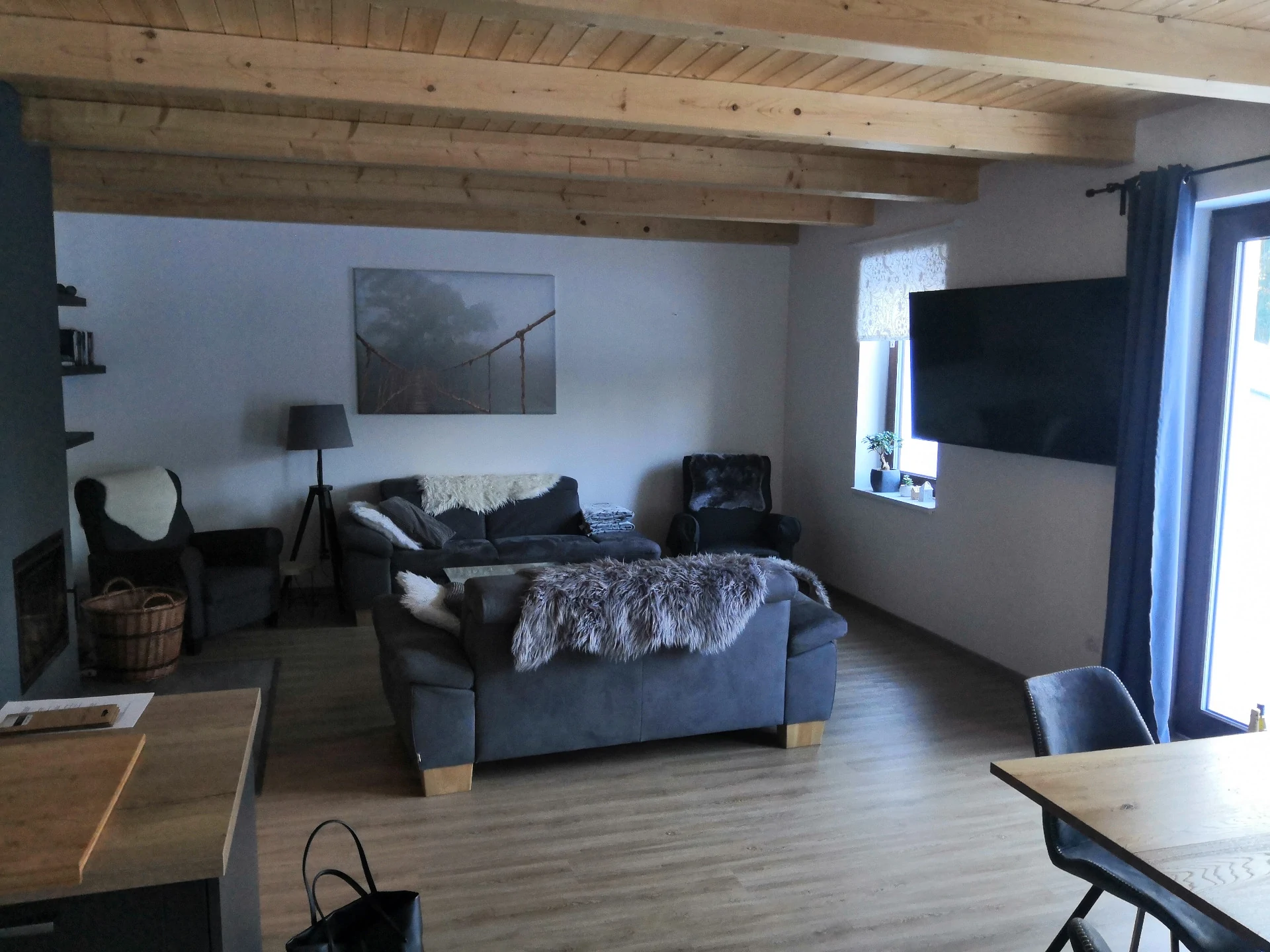 - Společenská místnost s krbem, jídelním stolem pro 12 osob, gauči a SMART TV.