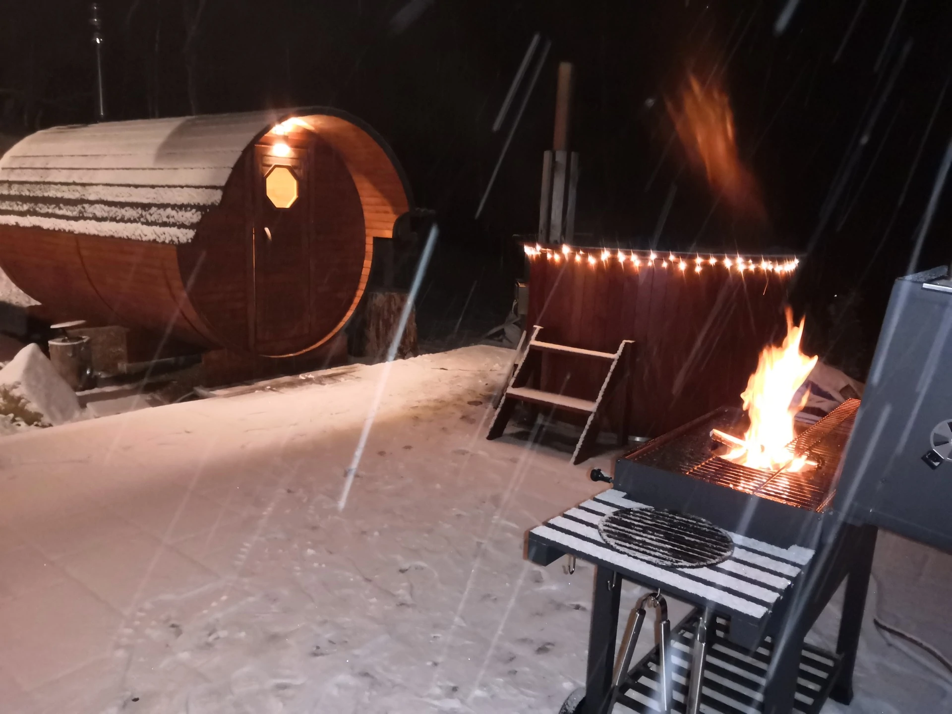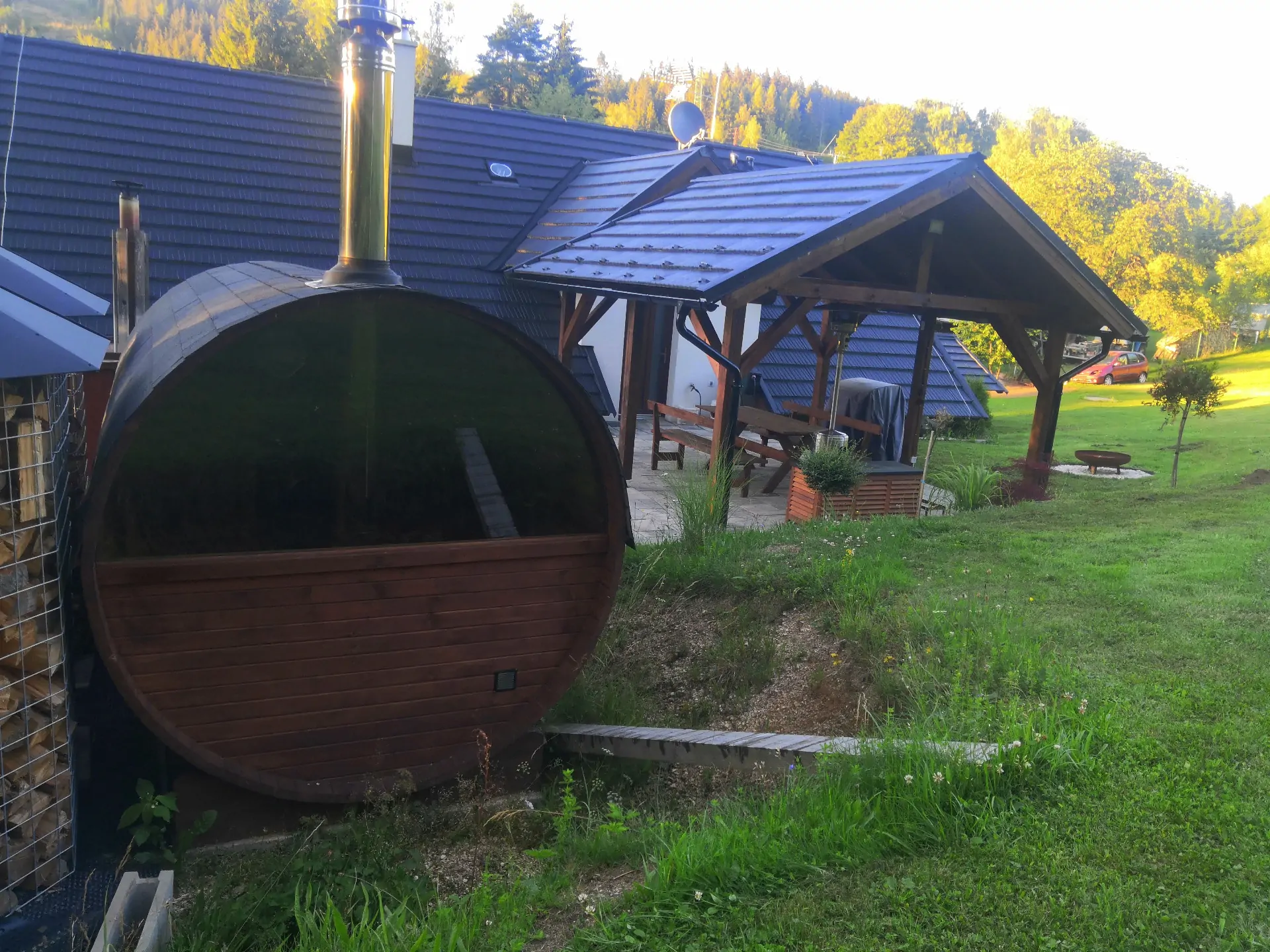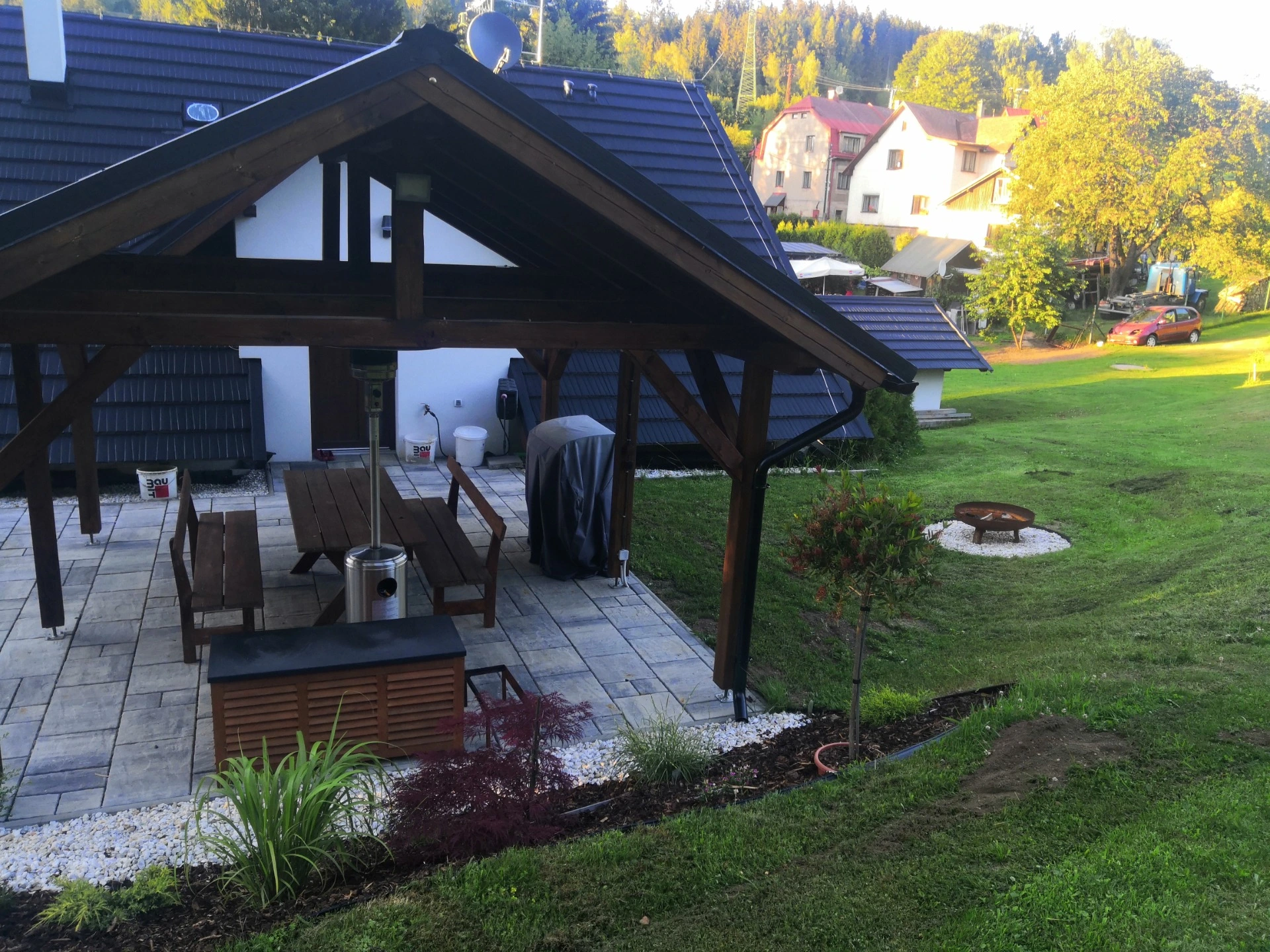 - Relaxační zóna na terase s altánem, grilem, ohništěm, saunou a koupacím sudem vyhřívaným na dřevo.