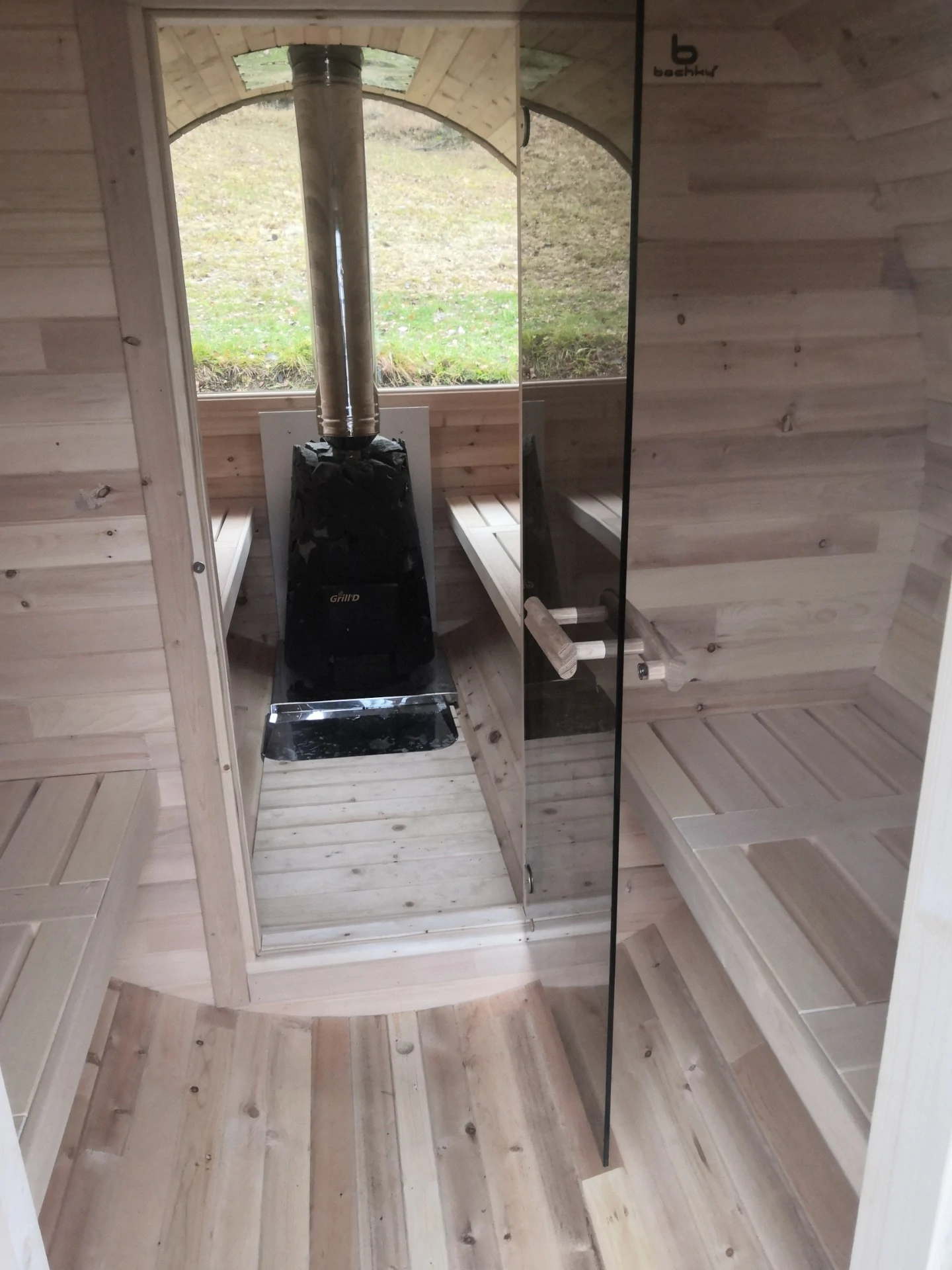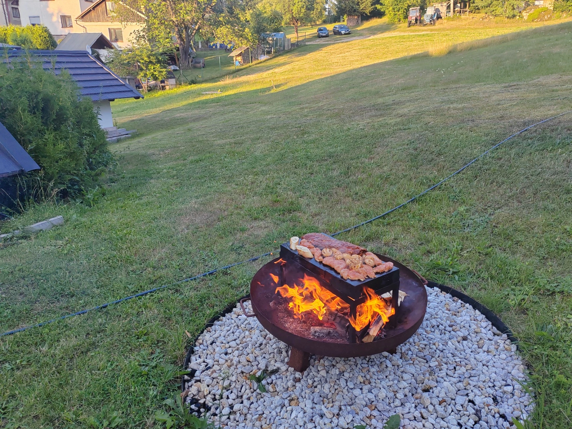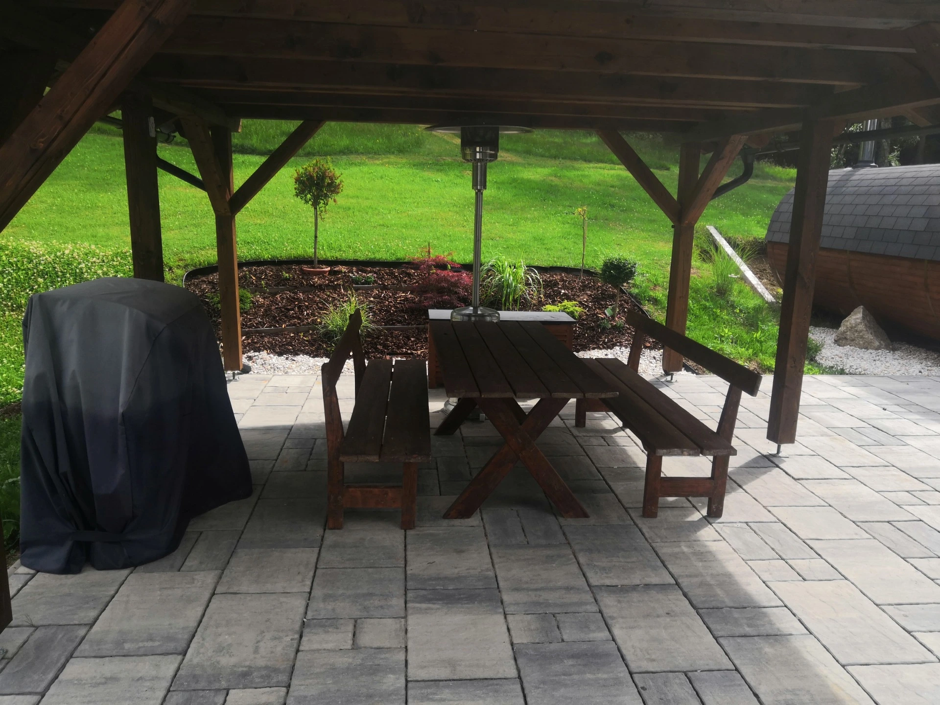 - Relaxační zóna na terase s altánem, grilem, ohništěm, saunou a koupacím sudem vyhřívaným na dřevo.