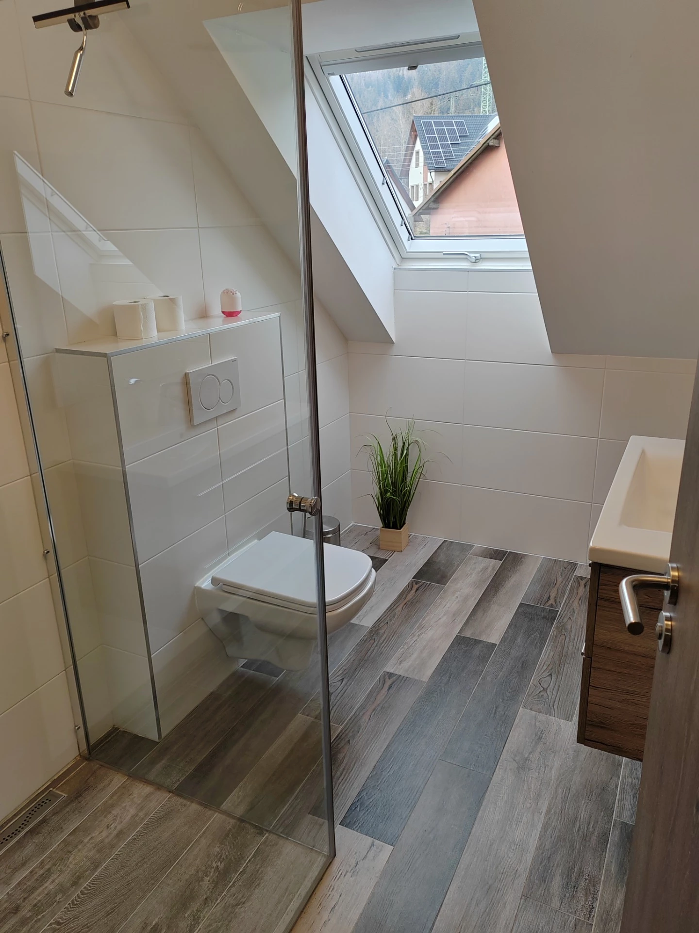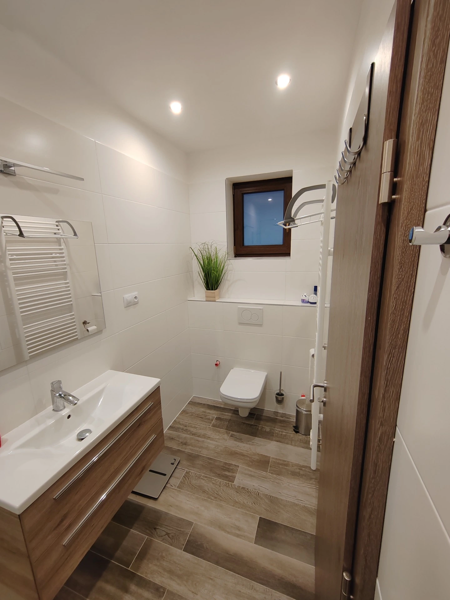 - Společná koupelna: Pokoj č. 4 a č. 5 sdílí jednu koupelnu se sprchovým koutem, umyvadlem a toaletou.