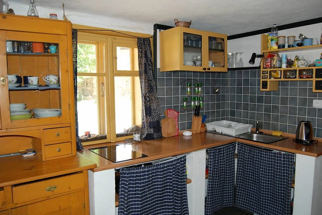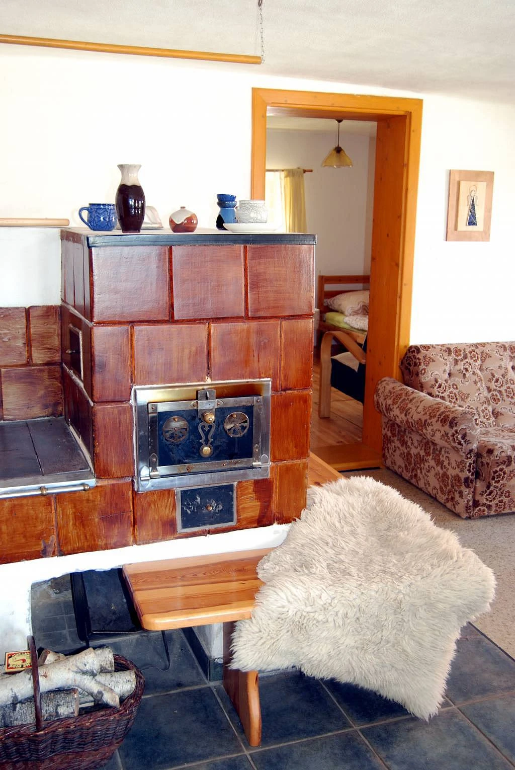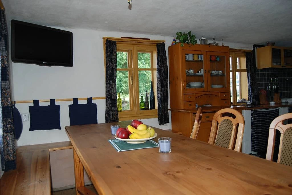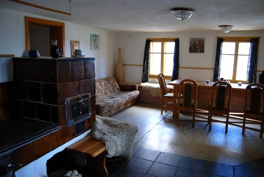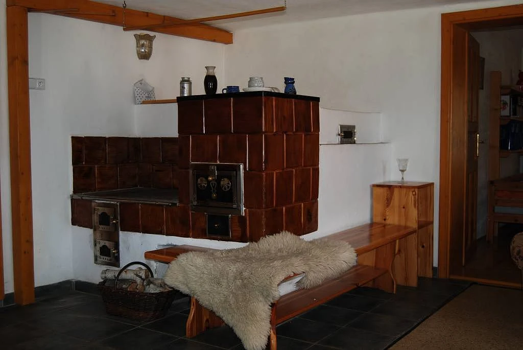 Obytný prostor s jídelním stolem, rozkládací pohovka. Klasická pec k vytápění, vaření a pečení, ale i k ležení. TV.