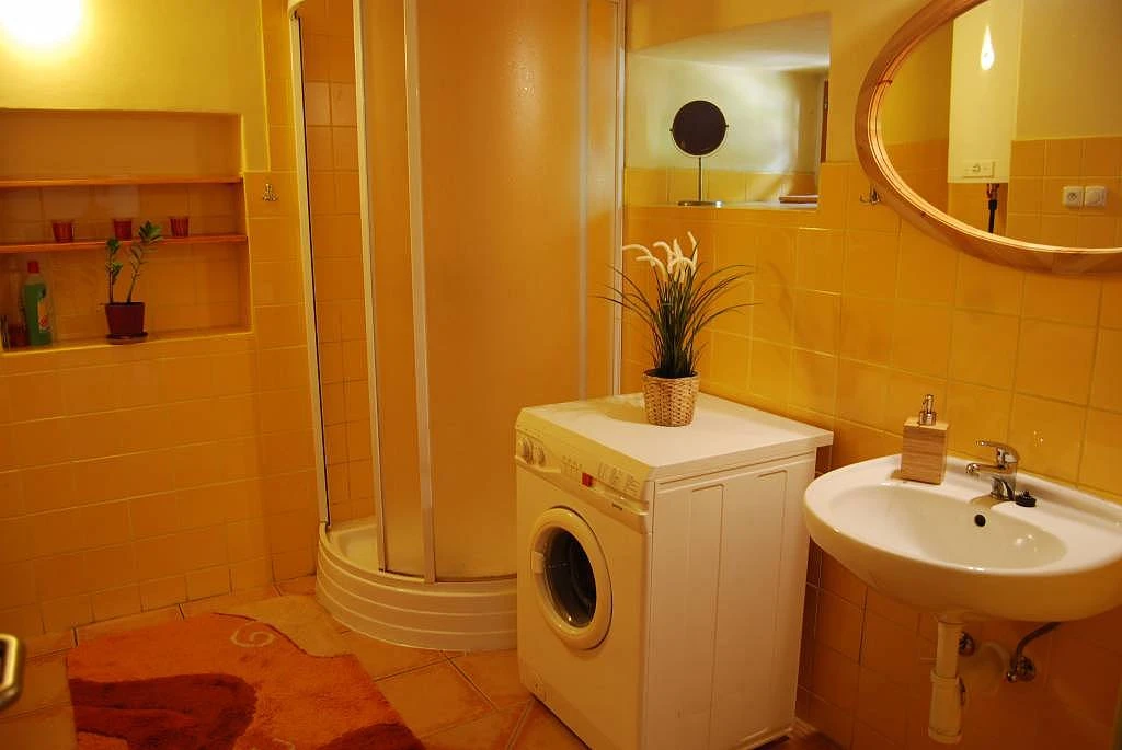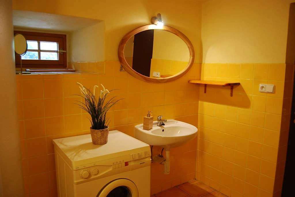 Koupelna se sprchovým koutem, pračkou a WC v přízemí.