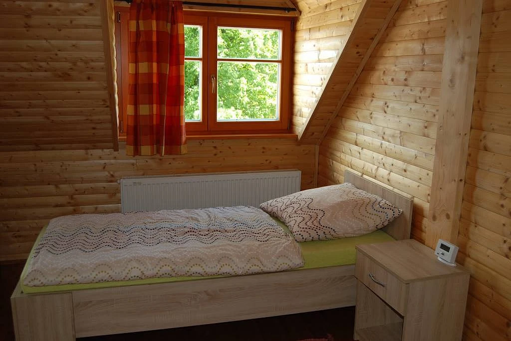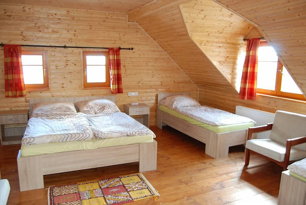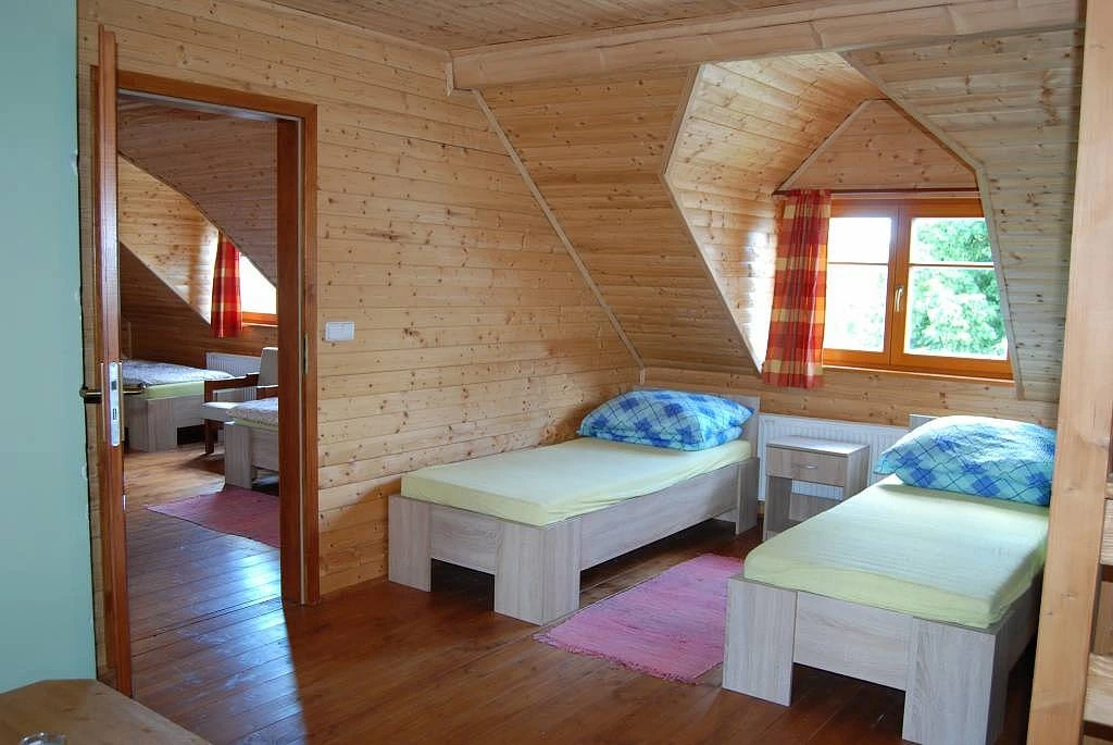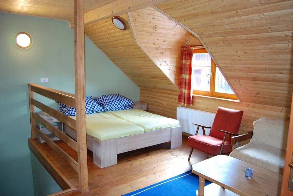 V přízemí je obytný prostor s kuchyňským a jídelním koutem, včetně klasické, funkční pece a rozkládací pohovky. V přízemí se dále nachází dva samostatné, dvoulůžkové pokoje. Samostatná toaleta a koupelna se nachází v přízemí chalupy. Koupelna je vybavena sprchovým koutem, bojlerem na teplou vodu a pračkou. Z venku i zevnitř chalupy je možnost uskladnit kola, lyže či jiné sportovní potřeby v prostorné kůlně. V dřevem obloženém půdním podkroví se nachází 2 samostatné, prostorné pokoje s výhledem do krajiny.