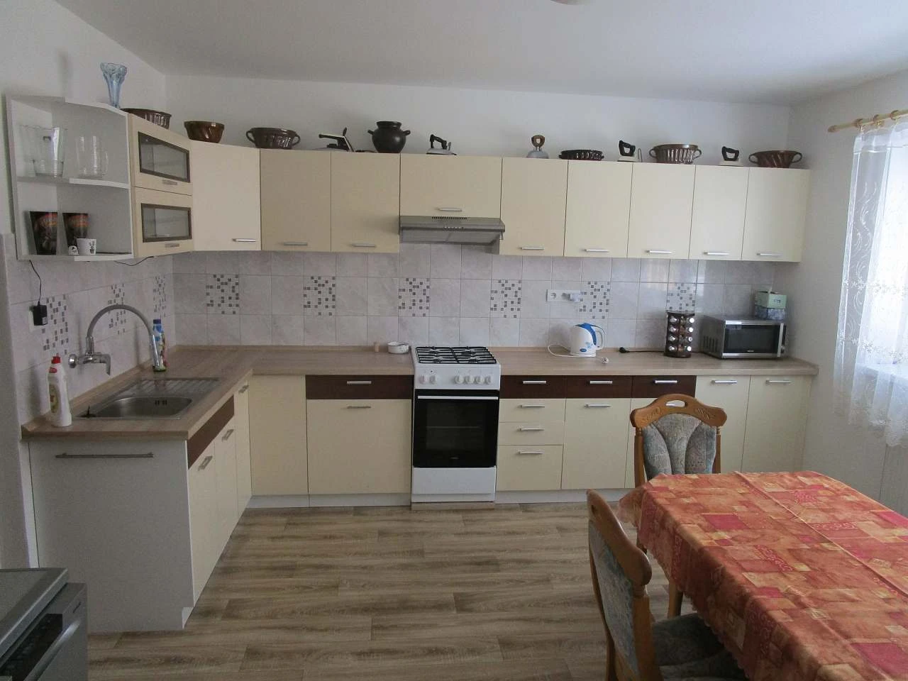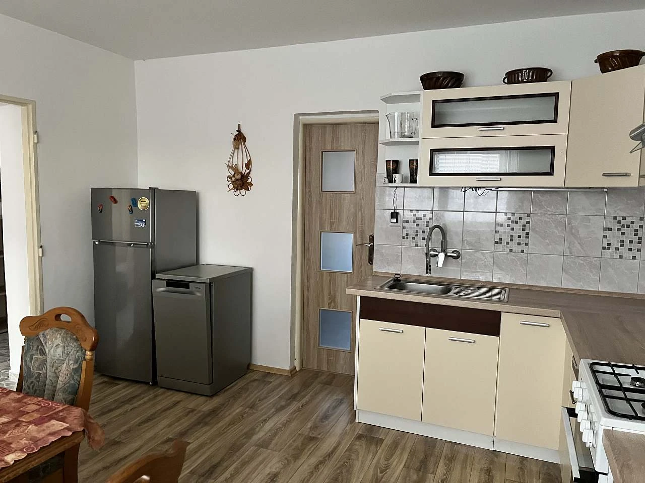 Kuchyně: jídelní stůl pro 6 osob, kuchyňská linka, lednice, mikrovlnná trouba, varná konvice, digestoř, plynový sporák s elektrickou troubou, myčka na nádobí, automatická pračka. Kuchyně je plně vybavená.