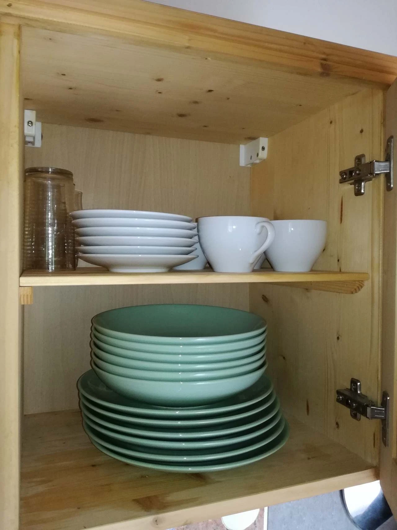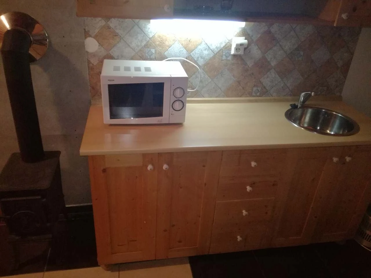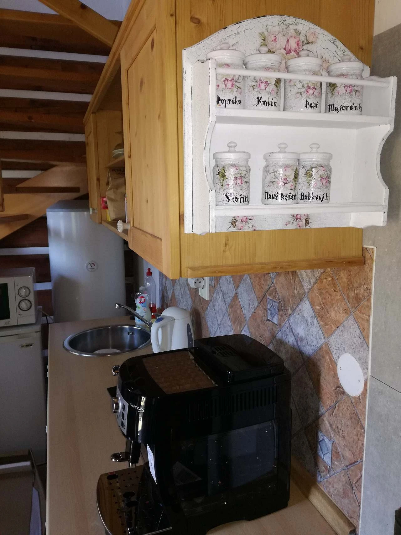 Plně vybavená kuchyň zahrnuje lednici, mikrovlnnou troubu, varnou konvici, elektrickou troubu s varnou deskou, nádobí, potravinovou skříň, kávovar a základní potraviny jako čaj, kávu, cukr, sůl a koření.