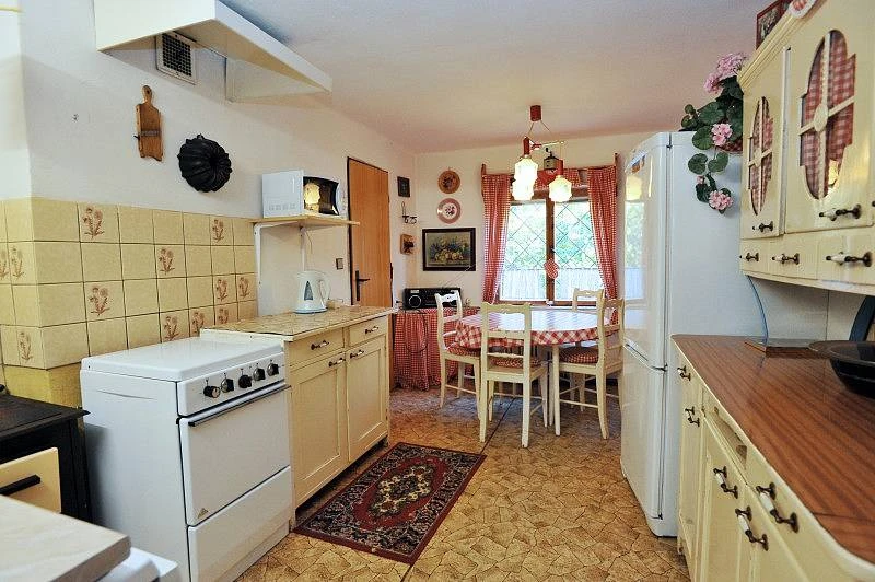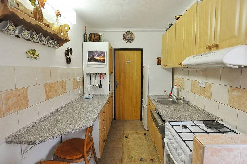 Zařízená kuchyňská linka s teplou vodou, plyn. sporák, lednice s mrazákem, myčka včetně tablet do myčky, mikrovlnná trouba, varná konvice, nádobí